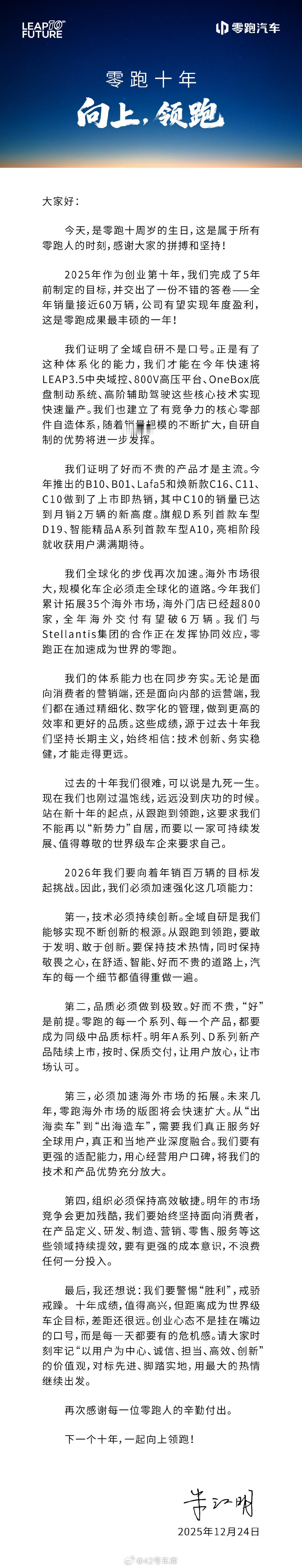 今天是零跑的十周年,朱江明发了一封长信:2025 年全年销量近 60 万辆,并有望实现年度盈利;多款新车爆发,接下来还有旗舰 D19 和精品小车 A10;今年拓展 35 个海外市场,海外门店超 800 家,海外交付 6 万辆;26 年的目标:年销百万。你觉得零跑可以做到吗?42how零跑 零跑汽车十周年
