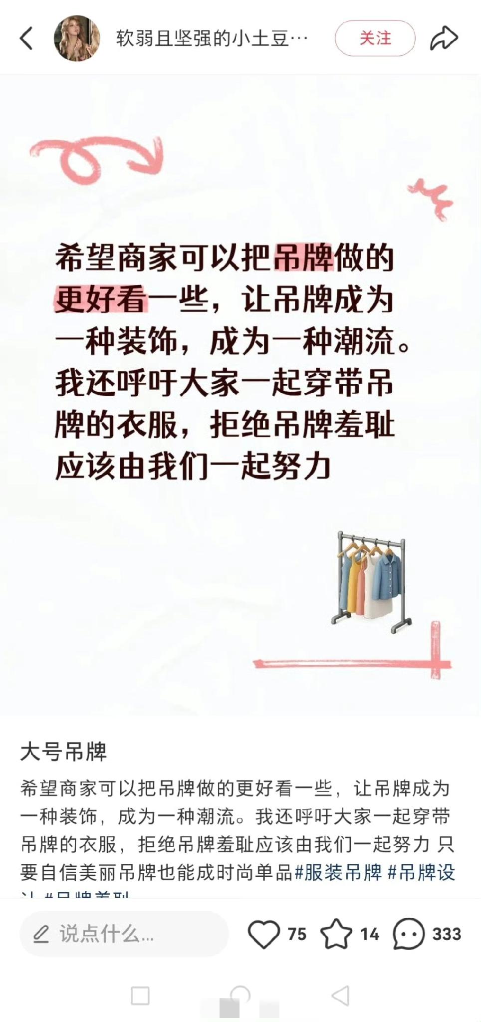 拒绝吊牌羞耻?很多人似乎分不清拒绝羞耻和恬不知耻。 本来大吊牌对那些正常买衣服的人就没有影响,只有对想白嫖衣服的人有影响。 甚至大吊牌还让正常买衣服的女性再也不用穿二手衣服了,这难道不是好事吗? 街头露吊牌 吊牌标识 无吊牌服装