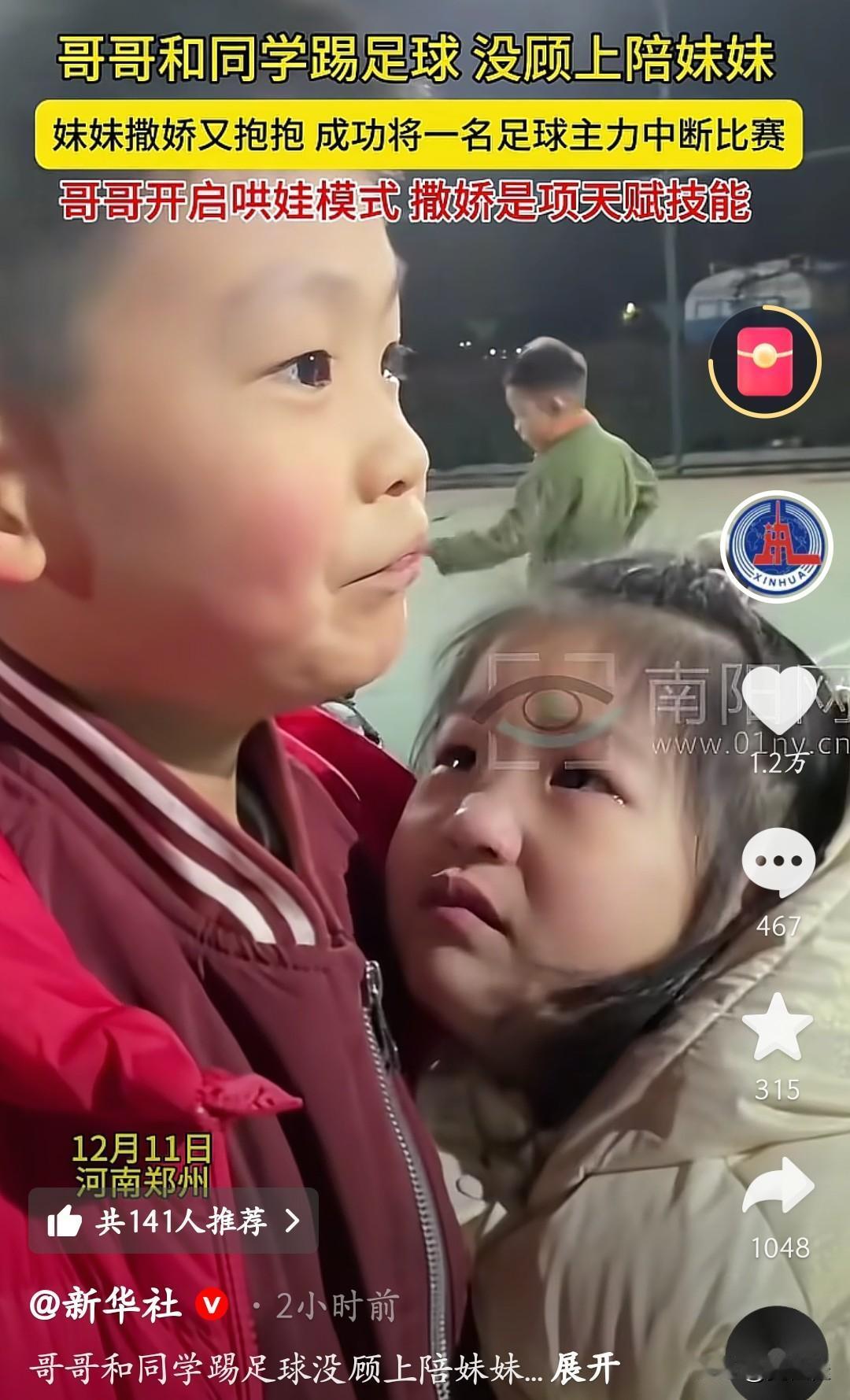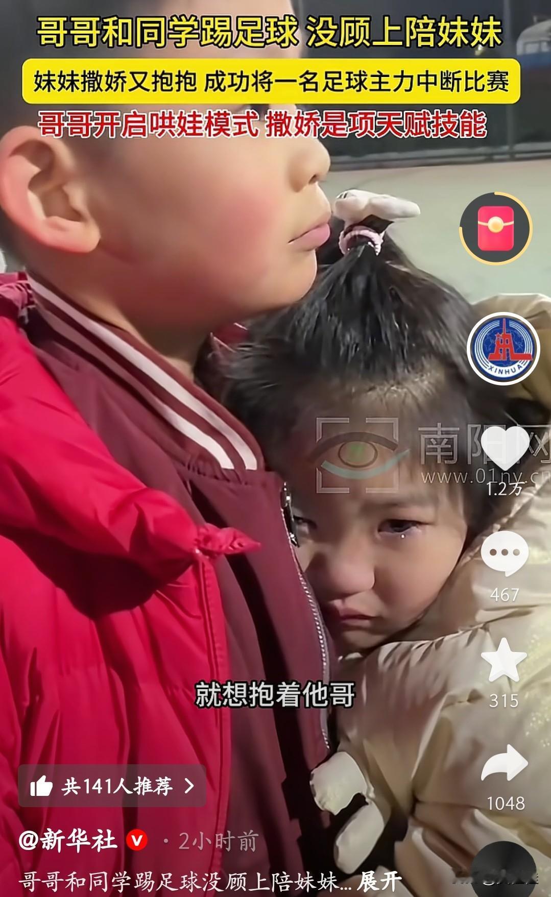 撒娇这招也太有杀伤力了!河南郑州的小哥哥和同学踢足球,光顾着比赛没顾上陪妹妹,小丫头当场就委屈得红了眼眶,凑上去抱着哥哥的胳膊撒娇,小脑袋还往哥哥怀里钻,硬是把球队主力的哥哥给喊停了比赛。 你看妹妹挂着泪珠的样子,小嘴一撇,嘴里还念叨着就想抱着哥哥,那委屈劲儿谁看了不心软。哥哥立马收了踢球的心思,一手揽着妹妹开启温柔哄娃模式,任凭妹妹黏着自己。 妹妹这撒娇是天生的技能,一招就制住了哥哥,再激烈的足球赛,在妹妹的委屈面前也得靠边站,这兄妹俩的互动也太暖心了!