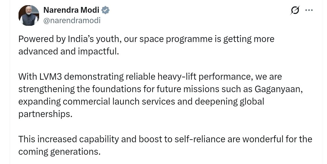 莫迪:在印度青年力量的推动下,我们的太空计划正变得越来越先进,影响越来越大。 LVM3 展现了可靠的重型运载性能,这为未来的任务(如 Gaganyaan 载人航天任务)奠定了基础,扩大了商业发射服务,并深化了全球合作伙伴关系。 这种能力的提升和自力更生能力的增强对子孙后代来说是件好事。
