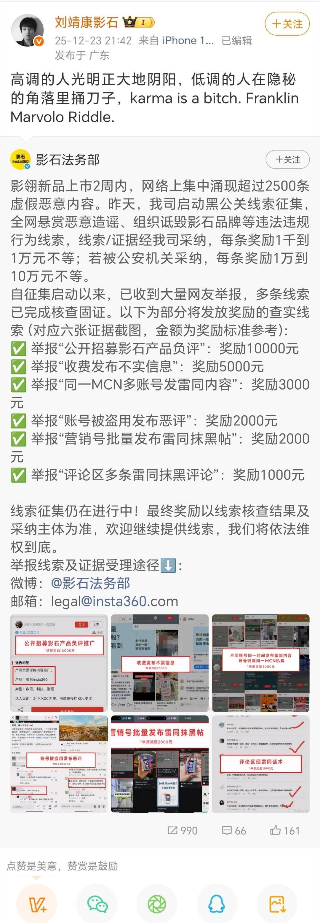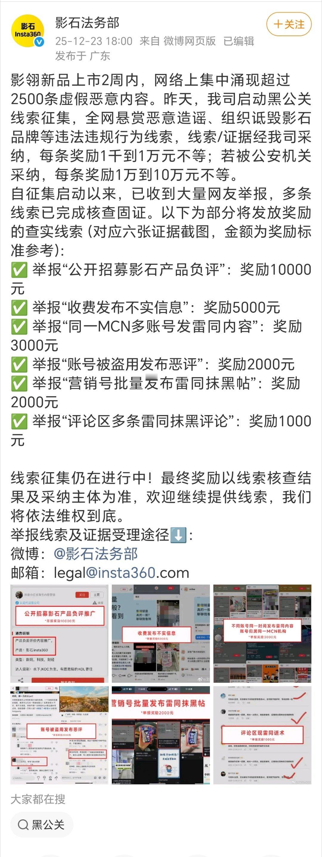 影石十万元悬赏黑公关影石CEO回应新品被抹黑影石法务部发文称新品遭到恶意抹黑,影石CEO刘靖康转发该博文并表示,高调的人光明正大地阴阳,低调的人在隐秘的角落里捅刀子。此前,影石法务部已作出回应,并表示全网悬赏恶意造谣、组织诋毁影石品牌等违法违规行为线索,线索/证据经我司采纳,每条奖励1千到1万元不等。