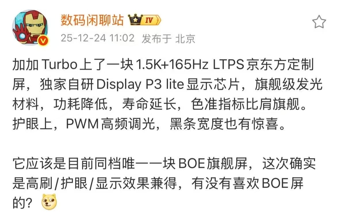 刚看到站哥的爆料,即将到来的一加Turbo新系列将搭载165Hz超高刷1.5K京东方屏,应该也是同档唯一搭载的产品,这就有点东西了,结合一加全场景明眸护眼,屏幕这块绝对给够了,据说还有9000mAh大电池和骁龙8系芯片,跑分达到260万,可以说完美结合性能、续航和屏幕,真的很不错,已经期待发布会了!