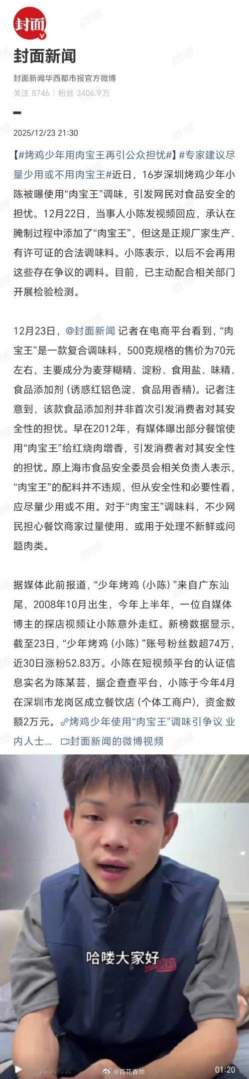 专家建议尽量少用或不用肉宝王当前公众食品安全焦虑与行业现实的错位。在“科技与狠活”等网络话题影响下,消费者对食品添加剂普遍存在担忧。然而,许多像“肉宝王”这样的复合调味料在餐饮业已使用多年,其合法性依赖于国家标准的监管。客观来看,“肉宝王”本身是一款合法的复合调味料,主要成分为麦芽糊精、食用盐、味精及香精等。食品安全专家指出,在标准内合理使用是安全的,其作用主要是提鲜增香,过量添加反而会产生怪味。公众担忧商家用它处理不新鲜肉类,但业内人士解释这并不可行。争议核心并非添加剂本身,而是商家宣传的“手工秘制”与实际工艺是否相符。16岁的小陈展现了超龄的担当。他迅速承认使用并主动配合抽检,承诺停用争议调料并公布结果。他出身贫寒,14岁辍学创业,每日工作长达17小时,其孝心与拼搏是很多人支持他的原因。这次争议对他而言,是从依赖“调味魔法”转向深耕食物本真风味的关键成长课。