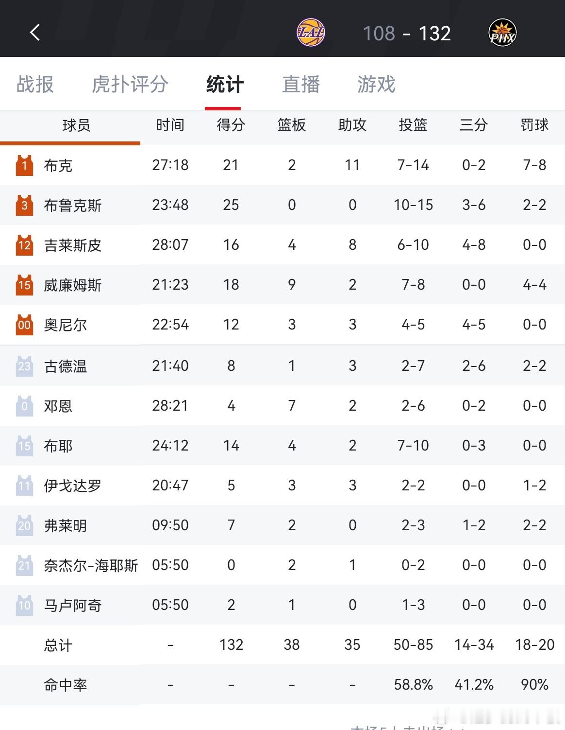 湖人108-132不敌太阳,两连败詹姆斯23分,里夫斯17分,艾顿12分10板湖
