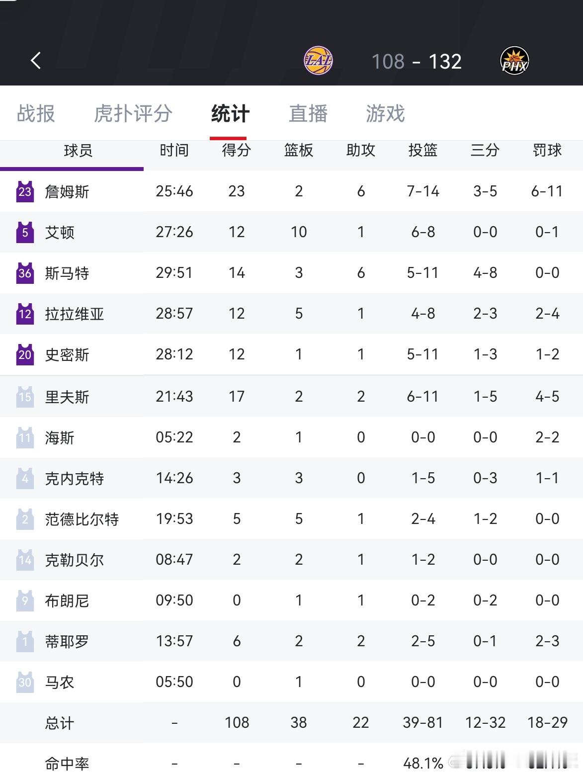 湖人108-132不敌太阳,两连败詹姆斯23分,里夫斯17分,艾顿12分10板湖人vs太阳
