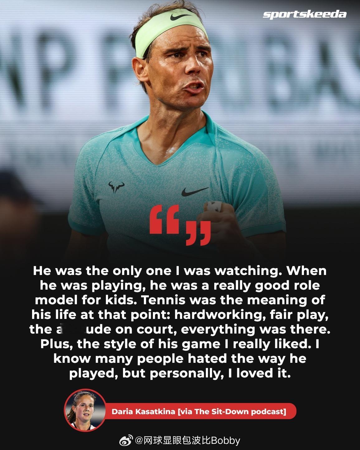 卡萨金娜在播客节目中谈起自己少年时的网球榜样:“我曾只专注看他一个人的比赛。在他打球时,他真的是孩子们绝佳的榜样。那时网球就是他生命的意义:努力、公平竞争、场上的态度……一切品质他都拥有。再加上,我真的很喜欢他的比赛风格。我知道很多人讨厌他的打法,但就我个人而言,我热爱那样的网球。”网球talking大会网球纳达尔wta