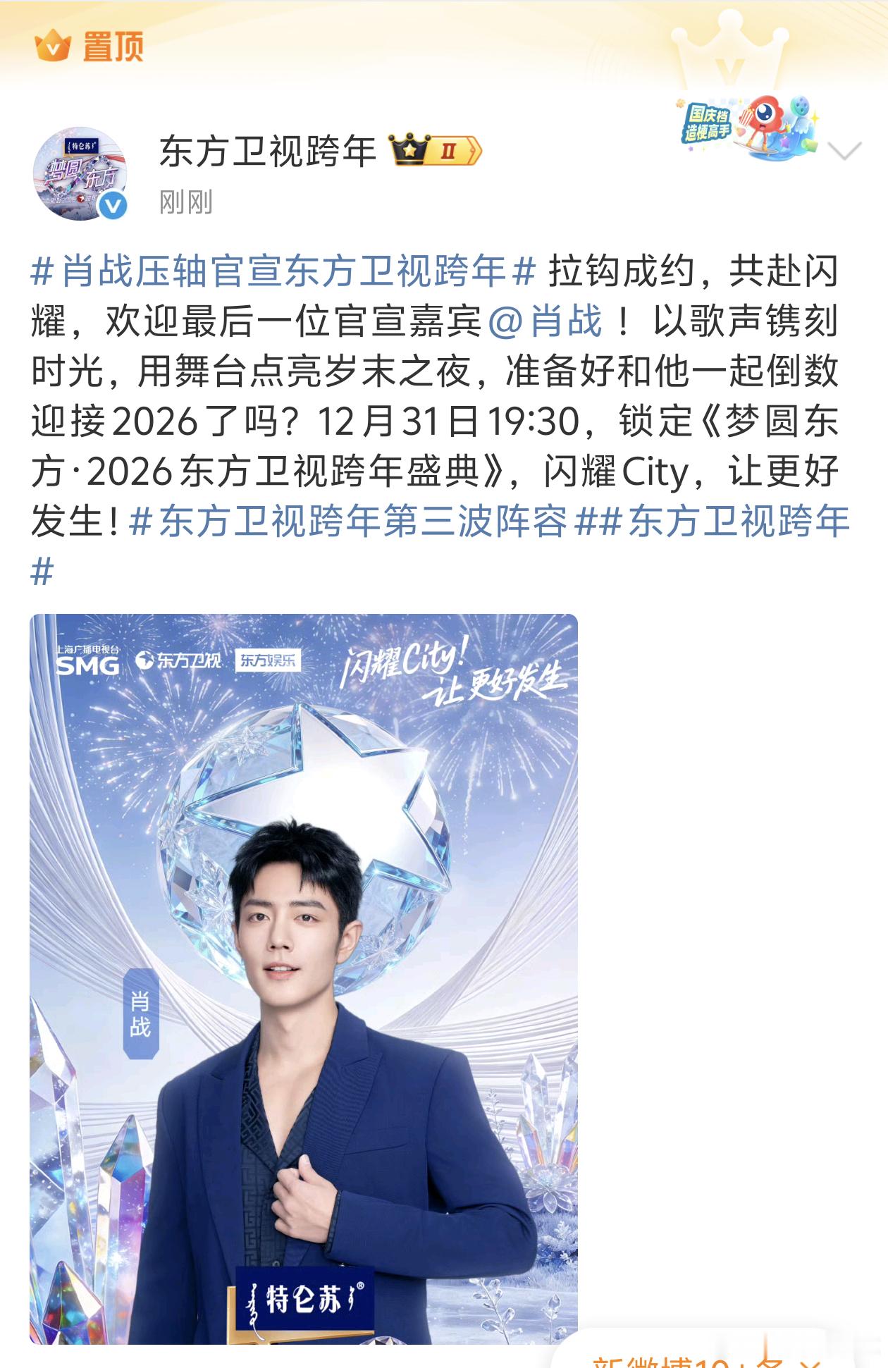其实我首页是先刷到yxh在发肖战压轴官宣东方卫视跨年的词条,我以为是yxh自己带的,然后点进去发现是官博带的,面对巨星官方自己会给足排面 肖战压轴官宣东方卫视跨年