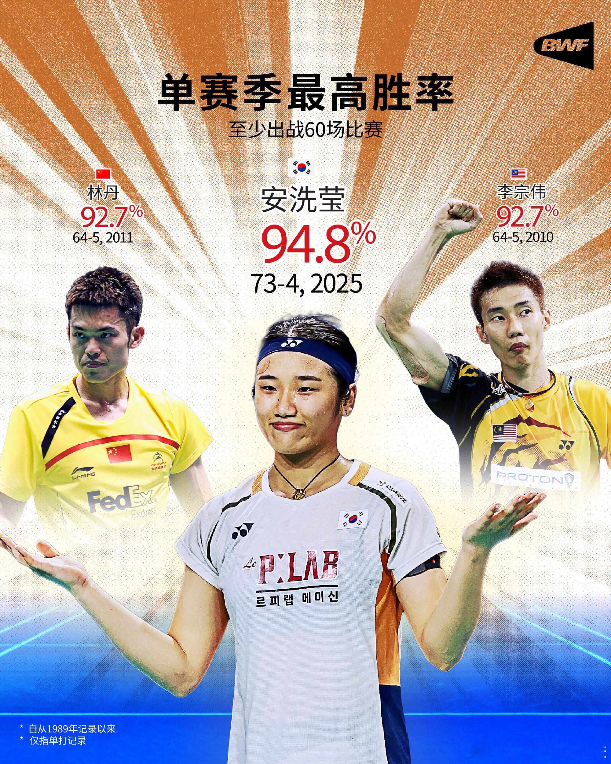 安少女的2025赛季:73胜4负,胜率高达94.8%,成为自1989年有详细记录以来,单赛季单打胜率最高(至少出战60场比赛以上)的运动员。四场失利分别来自陈雨菲(两次,其中一次是世锦赛女单半决赛)、山口茜和一次因伤退赛对阵韩悦。收获11冠,追平了日本名将桃田贤斗在2019年创下的单赛季11冠纪录,成为唯一一位在全部四项超级1000赛事中全胜的女单选手。安洗莹2025赛季73胜4负