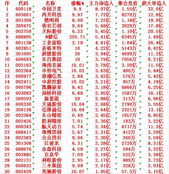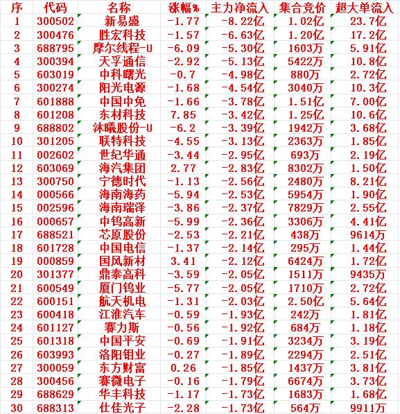 12月24日上午盘,主力趁低位,大幅买入的30名单 中国卫星:涨幅 8.90%,净流入 8.07 亿元 再升科技:涨幅 9.97%,净流入 7.72 亿元 德明利:涨幅 8.08%,净流入 7.22 亿元 香农芯创:涨幅 9.64%,净流入 5.68 亿元 天际股份:涨幅 6.22%,净流入 5.45 亿元 12月24日中午收盘,主力资金“大幅卖出”的30名单: 新易盛:跌幅 1.77%,净流出 8.22 亿元 胜宏科技:跌幅 1.57%,净流出 6.63 亿元 摩尔线程-U:跌幅 6.09%,净流出 5.30 亿元 天孚通信:跌幅 2.92%,净流出 5.13 亿元 中科曙光:跌幅 0.70%,净流出 4.98 亿元