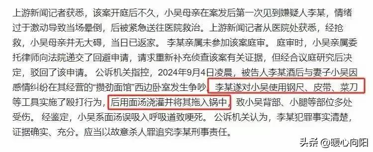 陕西灌面汤杀妻案看的让人后背发凉! 妻子吴杨莉性格懦弱,长期遭受家庭暴力,也不敢和娘家人说,就连回娘家也得丈夫李杨春同意,还限定时间。开面馆只能干活,却没有话语权,丈夫不顺心就打她,生活在丈夫的控制之下。 事发当晚,吴杨莉的父母赶到面馆后,两人看见女儿全身赤裸地躺在厨房地上,肚子鼓起,头上、身体、两臂有明显的伤痕。 简直不是人啊!简直就是一个恶魔!