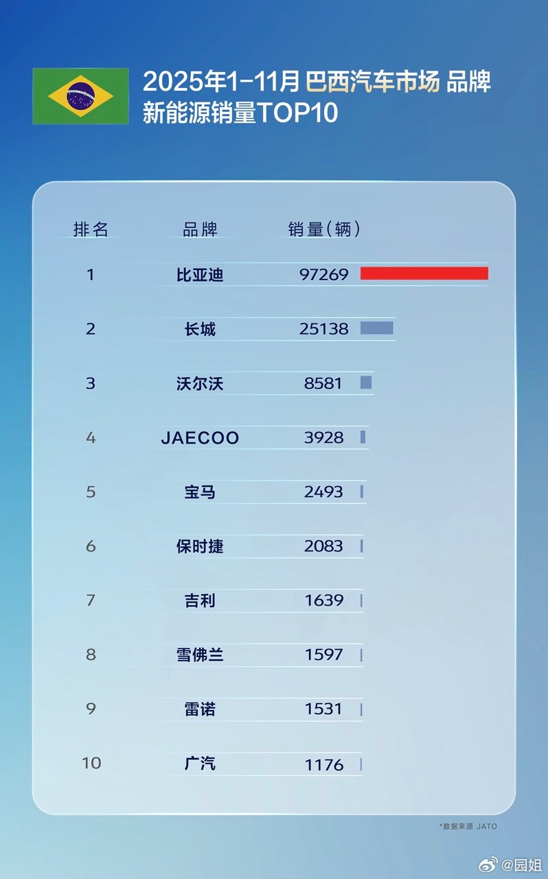 一个月出口12.8万台,比亚迪最近海外势头很猛啊。比亚迪不仅是在巴西市场表现很出色,而且在土耳其、意大利、西班牙等国斩获新能源汽车销量冠军,更在新加坡等国家登顶全品牌销量榜首。而且不仅是这个月出口势头猛,1-11月比亚迪在多个核心市场持续领跑,而且在11个汽车核心国家市场的销量直接给特斯拉反超了。真正意义上实现了多国销冠全面超越。而这出色的成绩离不开比亚迪丰富的产品体系支撑,可以针对不同市场需求快速生产出合适的车型。而且最重要的是,比亚迪不仅仅只依赖整车出口,像巴西等地的本地化生产也是加速品牌征战海外市场的重要方式。如今比亚迪出海足迹已遍布119个国家和地区,加上近期第1500万辆新能源汽车下线的里程碑,中国的汽车品牌在事实上引领全球出行方式的新变革。