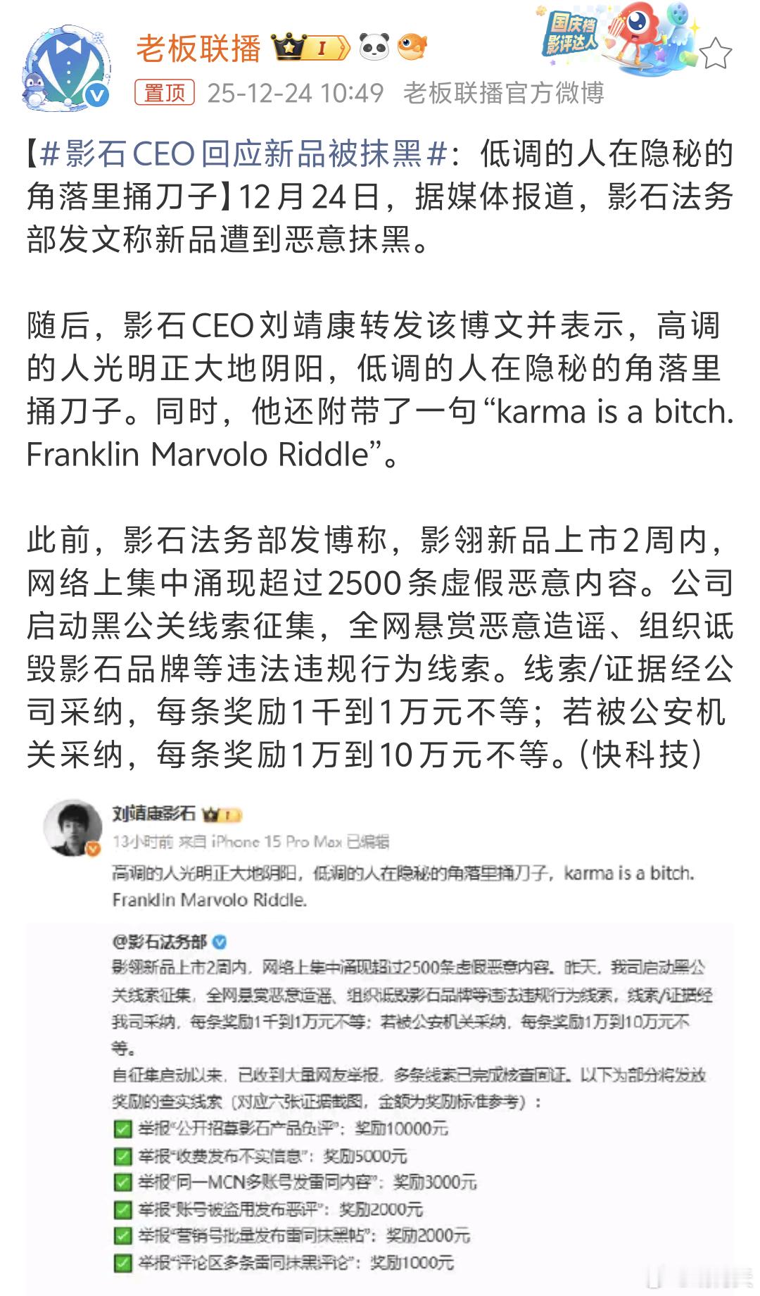 这个套路在华为新品发布后也很常见,这些水军账号不仅吃人血馒头,还影响舆论场的风气气正。呼吁严厉打击刷评论黑产业!影石ceo回应新品被抹黑影石十万元悬赏黑公关