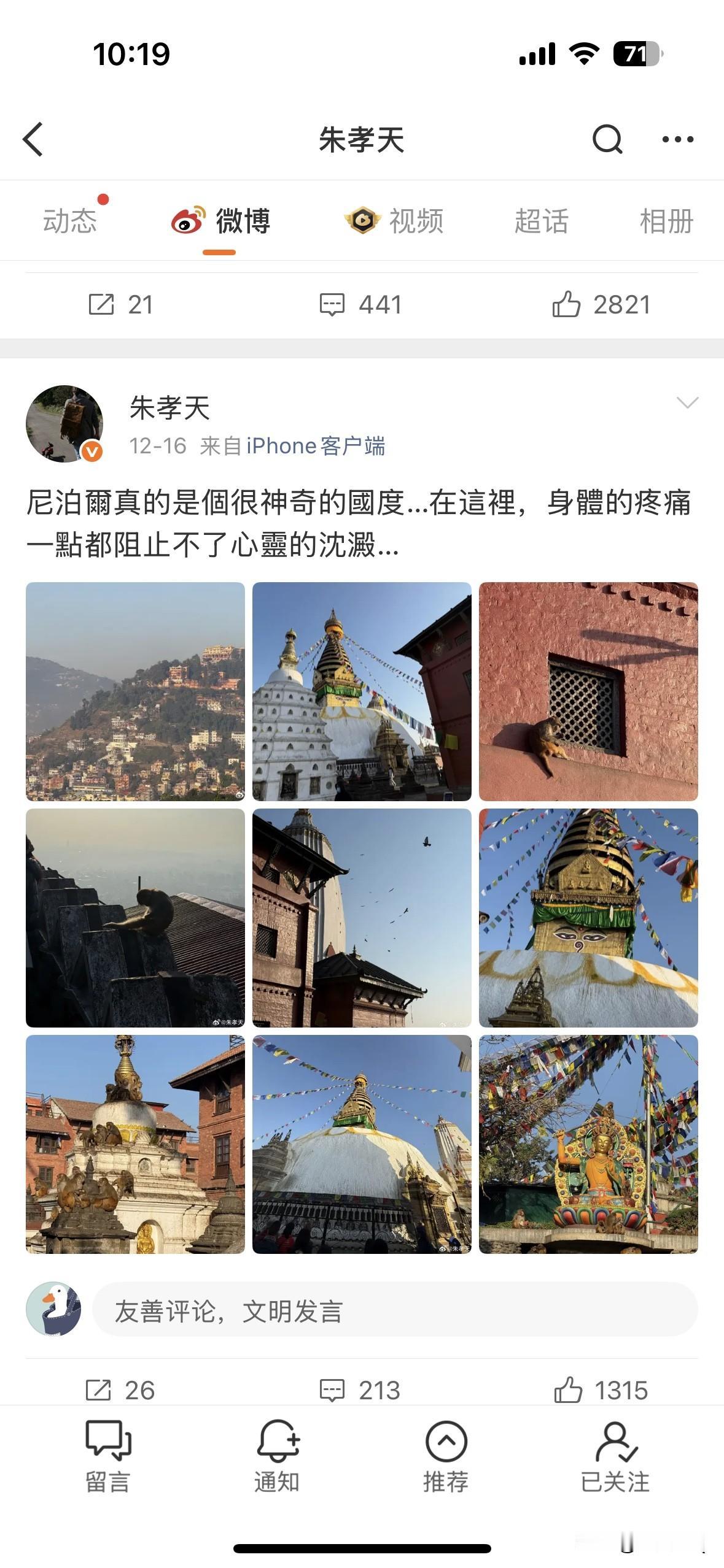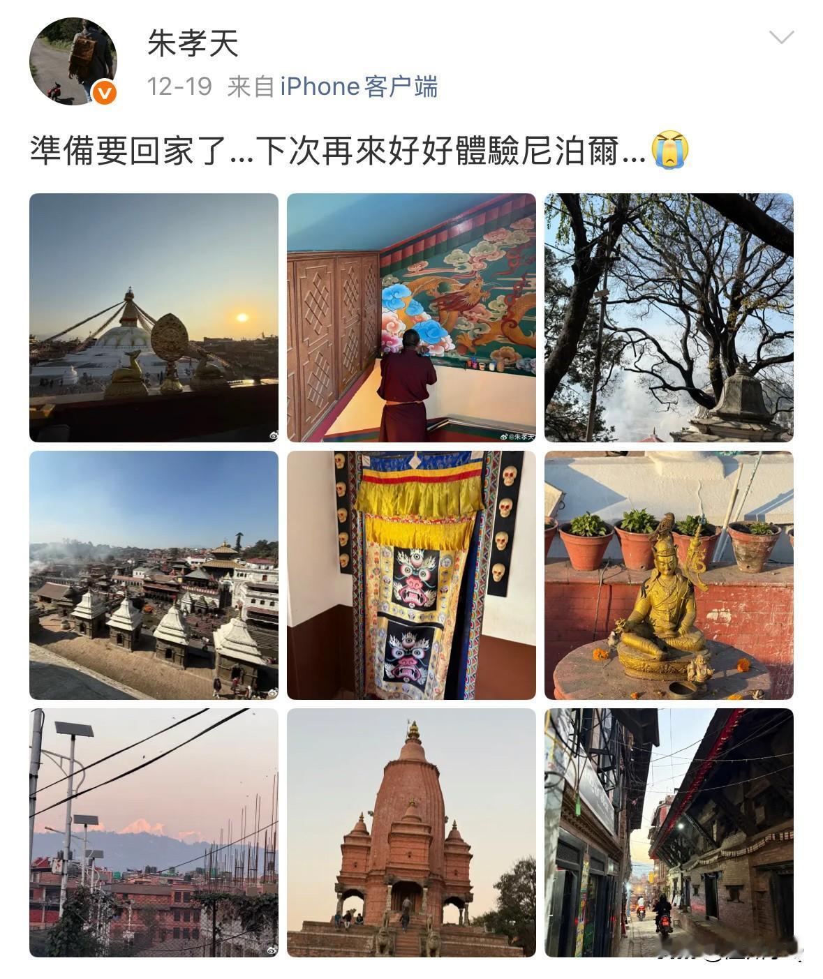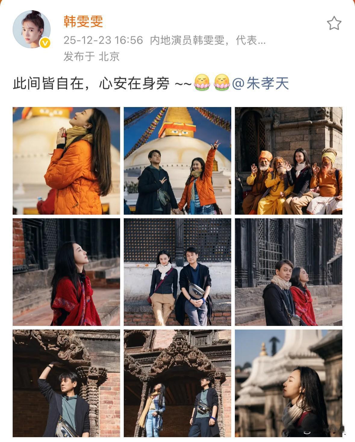 我敢说,朱孝天绝对是个不解风情的直男。 朱孝天和老婆韩雯雯一起去尼泊尔旅行,韩雯雯拍得都是两人的合照或自己的美照,还特意艾特朱孝天,而朱孝天的发文里只有风景和建筑,没有一张两人的照片,像是只身一人去的旅行。 如果是女生看到另外一半发这样的照片,大多数看完都不会高兴。