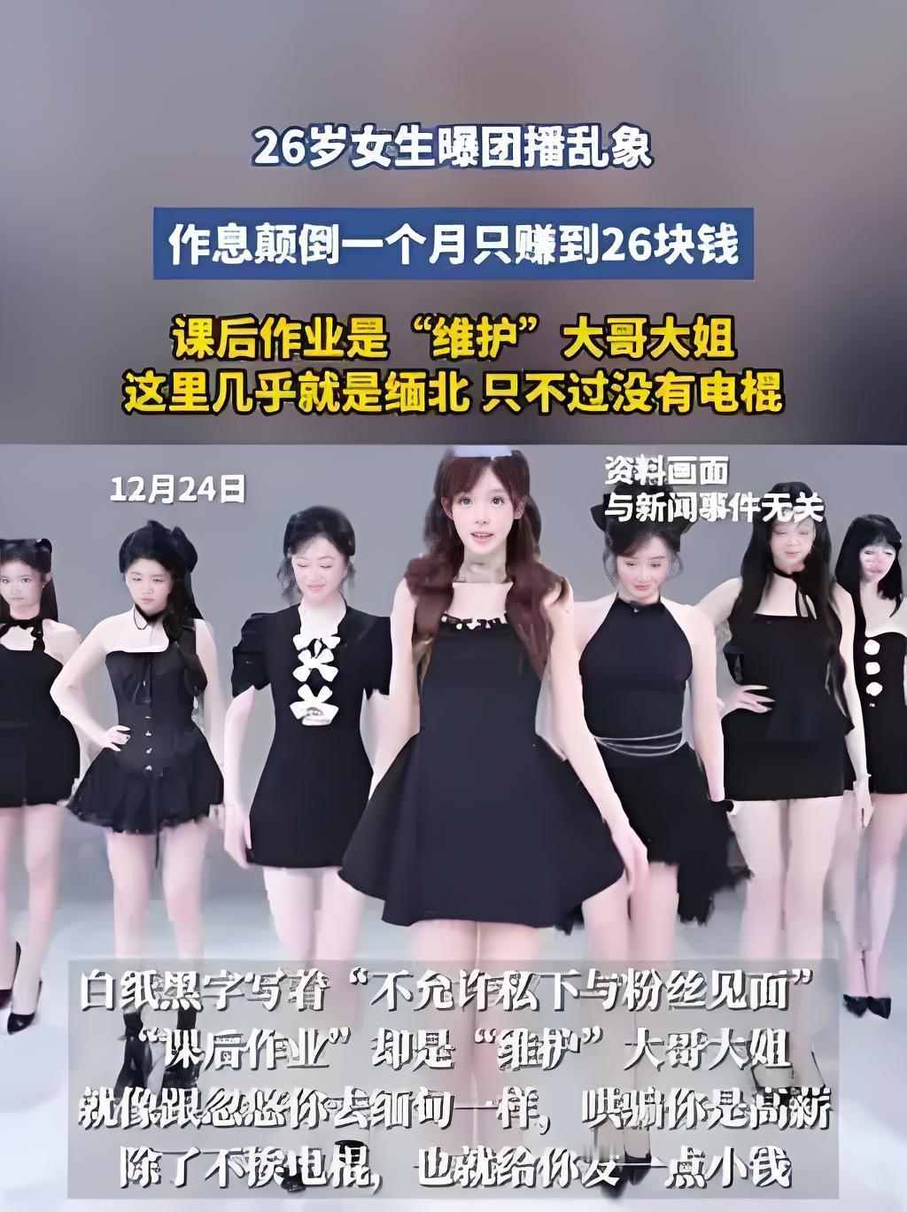 26岁女生小羽的经历,给所有想做直播的年轻人敲了个警钟! 她做团播两个月,每天对着镜头又唱又跳,结果扣除自费买服装的钱,最后只拿到26块钱月薪,更离谱的是,想走都走不了,公司拿着合同威胁,说敢离职就赔高额违约金… 现在打开手机,全是直播月入过万,低门槛轻松赚钱的宣传,把好多刚毕业的年轻人、甚至未成年都忽悠进来。 再看看身边,实体工厂、制造业明明缺人缺得厉害,愿意去的年轻人却越来越少,大家都觉得进工厂又累又不体面,不如直播来钱快,可真正能赚到钱的有几个? 现在年轻人也不容易,不过是想找份工作混口饭吃,却被这些黑心公司当成韭菜,直播行业真的不能再乱下去了,该好好整顿整顿,也让更多人看清真相! 应届生当主播 网红小羽