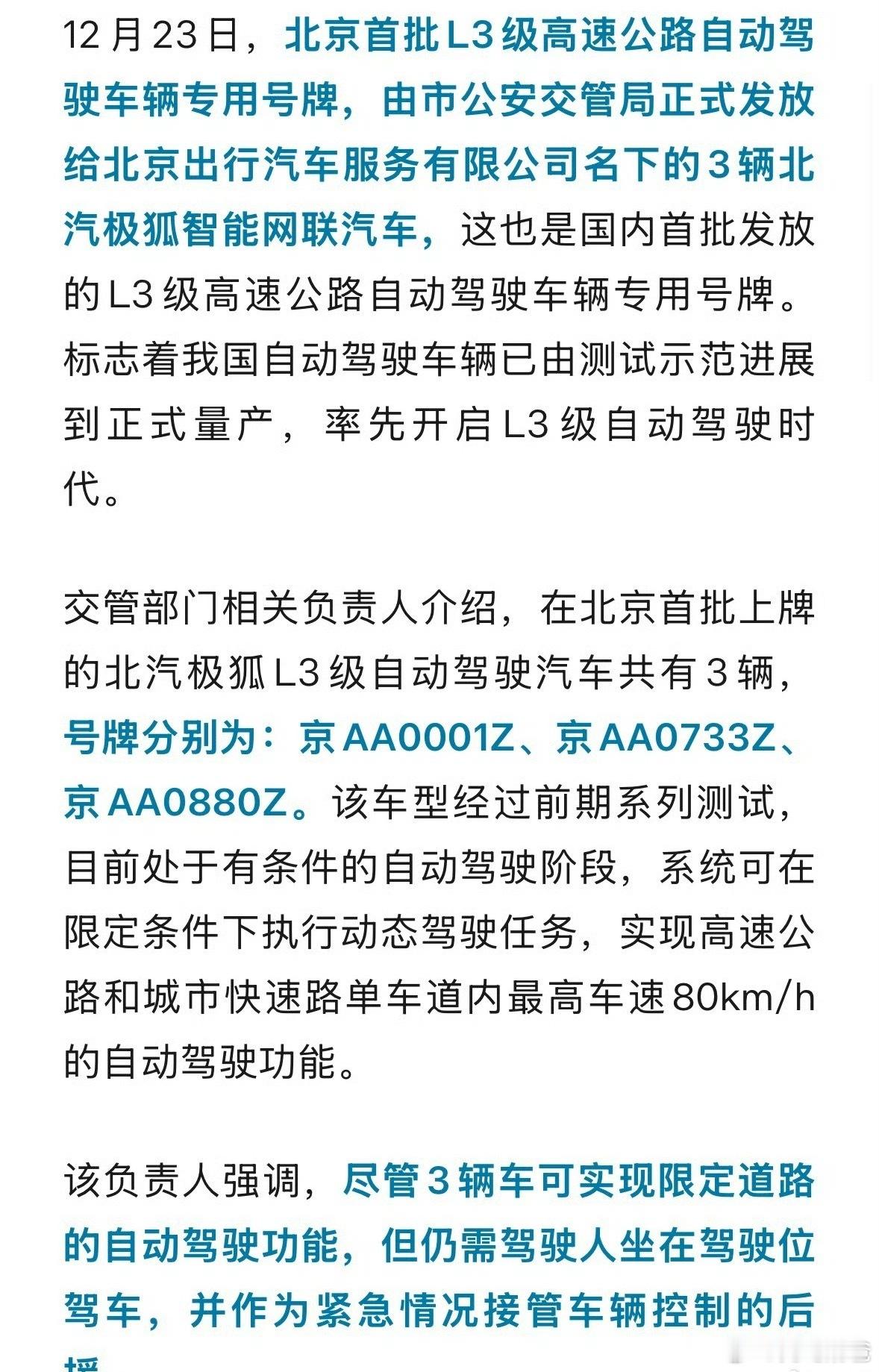 首批L3高速专用号牌什么样】L3级是有条件自动驾驶12月23日,北京首批L3级自动驾驶专用正式号牌完成上牌。北汽集团披露,北汽极狐阿尔法S(L3版)完成了“京AA0001Z”“京AA0733Z”“京AA0880Z”号牌登记。北京首批L3级高速自动驾驶车辆上牌12月15日,北汽集团旗下极狐阿尔法S(L3版)正式获批工信部自动驾驶车型产品准入许可。仅隔7天,首批专用号牌即顺利走完了上牌登记的全流程,从“技术验证”迈入“合法通行”的实战新阶段。极狐阿尔法S(L3版)是首批获得准入许可的车型中唯一配备激光雷达的车型,为其感知系统的安全冗余与运行提供了硬件保障。上牌之前,北汽极狐L3经历了测试与安全评估,在全面自测基础上也通过了公安交管部门组织的自动驾驶交规符合性测试,并在试点高速路段开展了交通事故、交通违法全流程应急演练。根据规划,这批车辆将率先在京台高速、机场北线高速、大兴机场高速等指定路段开展试点运行,在真实复杂路况中积累运营经验,为后续规模化商业应用筑牢基础。根据《汽车驾驶自动化分级》标准,自动驾驶分为L0至L5六个等级,其中L2级为组合驾驶辅助,L3级为有条件自动驾驶。当前市场上很多可实现高速和城市辅助驾驶的车型还属于L2级。L3级自动驾驶系统可让用户在特定场景条件下从驾驶任务中脱离出来,但用户要保持接管能力,及时处理特殊情况。北京智能网联汽车技术和产业正在加速成长。北汽集团相关负责人向记者表示,北汽专属的智能网联技术体系——“北汽元境智能”在行业内率先实现L2级到L4级全覆盖。通过部署企业自动驾驶安全监测平台,实现对在途车辆的“7×24小时”状态监测与数据分析,提升主动安全监测与应急响应能力。数据显示,今年1月到11月,北汽极狐累计销售13.66万辆,同比增长97.99%;北京越野11月单月销量达2.24万辆,突破新高,BJ40增程元境智行版成为全国首款纯视觉技术方案的越野车型,可应对复杂的越野场景;享界汽车稳居30万元以上高端新能源轿车销量冠军,12月交付将破万辆。相关负责人说,此次获得全国首批L3级自动驾驶专用正式号牌,既是对产品智能安全水平的一次高标准系统化核验,也将推动北京智能网联汽车产业链进一步升级,为京津冀汽车产业智能化转型提供实践