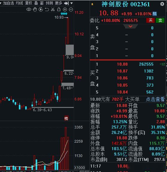 A股又现极限博弈名场面!神剑股份开盘竞价被30万手巨单死死按在跌停板上,一笔笔天量买单突然疯狂涌入,30万手压单如同被推土机横扫,瞬间清零!股价从跌停板直线拉升,分时图拉出陡峭直角,上演“从地狱到天堂”的极致反转,引爆全市场热议。