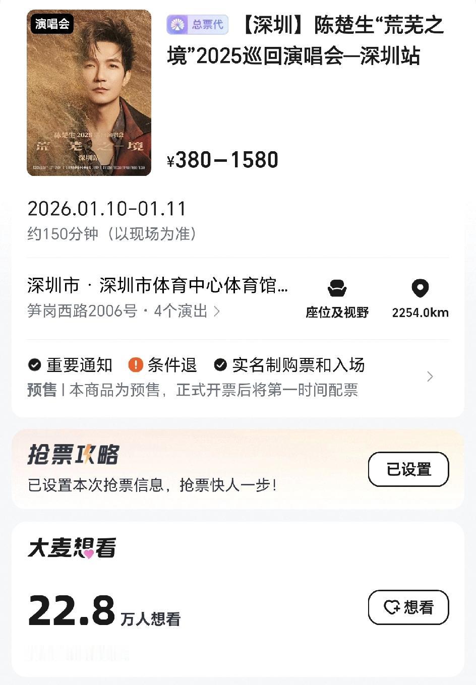 陈楚生《荒芜之境》深圳收官演唱会开票秒没,这回是真的收官了,再不看没机会了! 今天陈楚生冲上了大麦热搜的第一位,深圳场的想看人数达到了22万,是陈楚生历次演唱会人数之最,真的是越来越火了,付出总会有回报! 深圳场卖的这么好有两个原因,一个是因为确实是收官,还有一个原因是北京场太火了,北京场的致敬迈克尔杰克逊版《晚礼服》再一次刷新了歌迷对陈楚生的认知,都到了巡演的倒数第二个城市,还能花这么大的心思编排这么有难度的歌曲,这诚意谁能不爱,好多已经观看过其他场的歌迷们纷纷表示收官场必冲,所以这票开场就没了。 建议陈楚生能加场,这么花心思的荒芜之境,场次太少了,四面台受限,可能很多场馆都达不到演出效果,如果能在深圳加场也是一个不错的事情哦,毕竟下一次还不知道要等多久。陈楚生