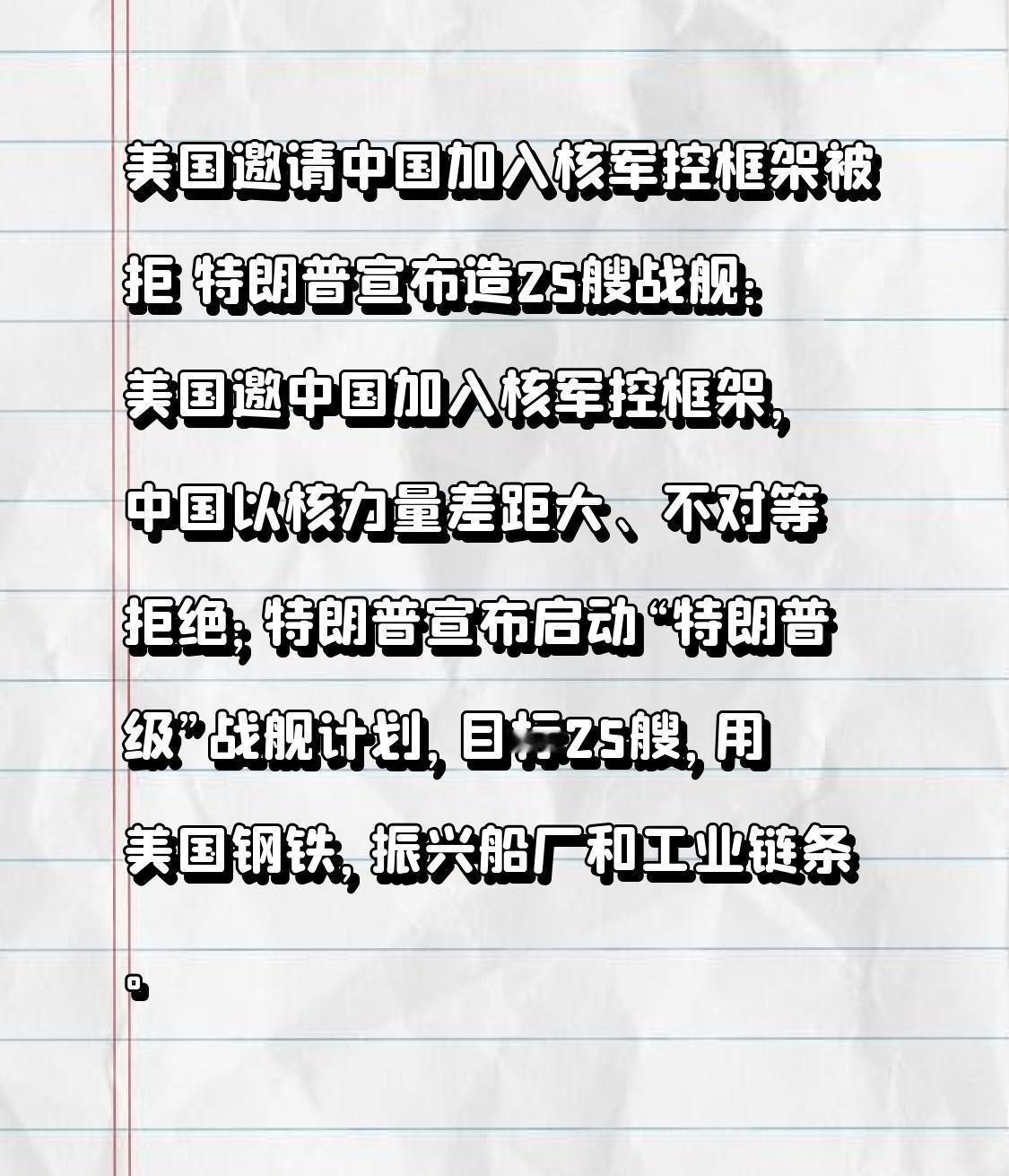 美国邀请中国加入核军控框架被拒 特朗普宣布造25艘战舰:美国邀中国加入核军控框架,中国以核力量差距大、不对等拒绝;特朗普宣布启动“特朗普级”战舰计划,目标25艘,用美国钢铁,振兴船厂和工业链条。