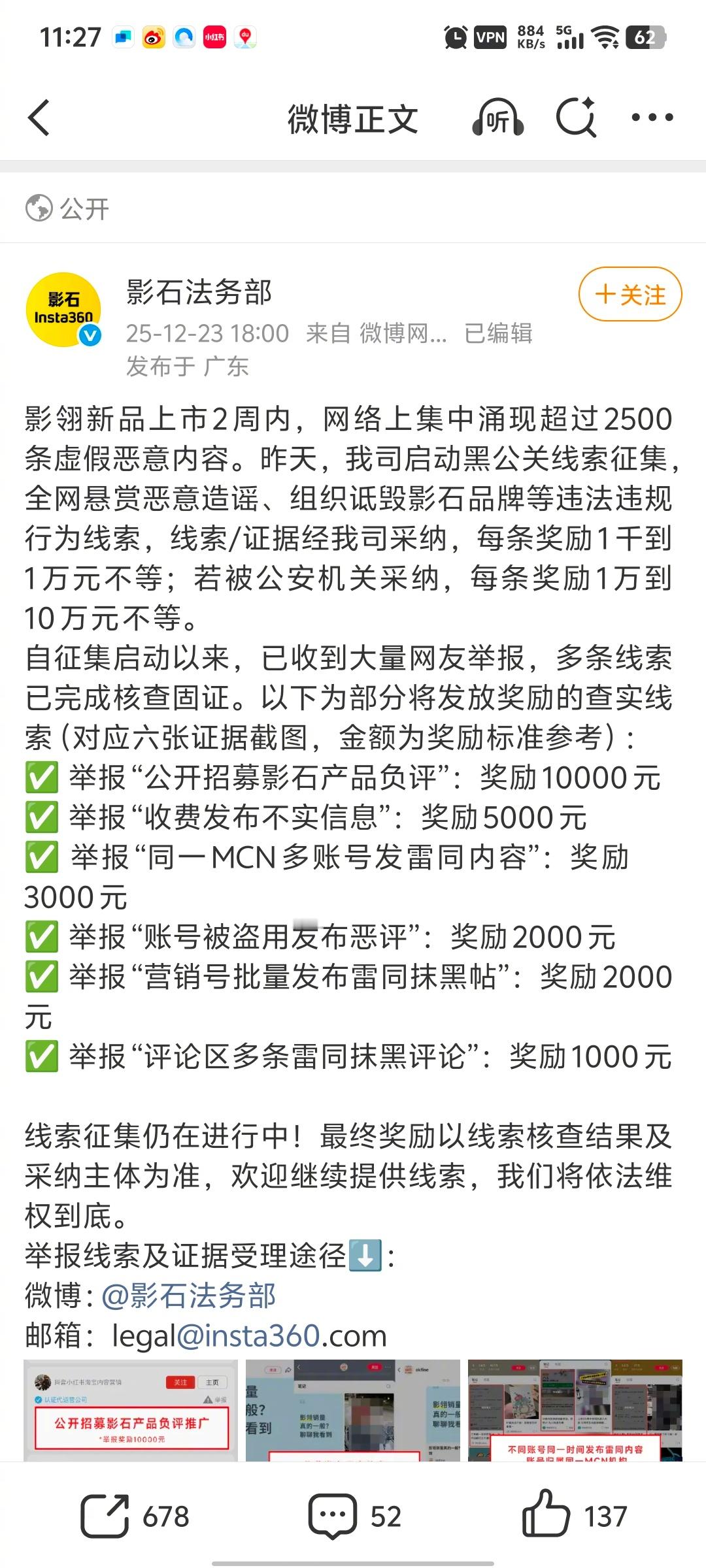 恶意抹黑不可取,打击黑公关的行为应该支持!这次举报的奖励幅度还是很大的!影石CEO回应新品被抹黑影石十万元悬赏黑公关