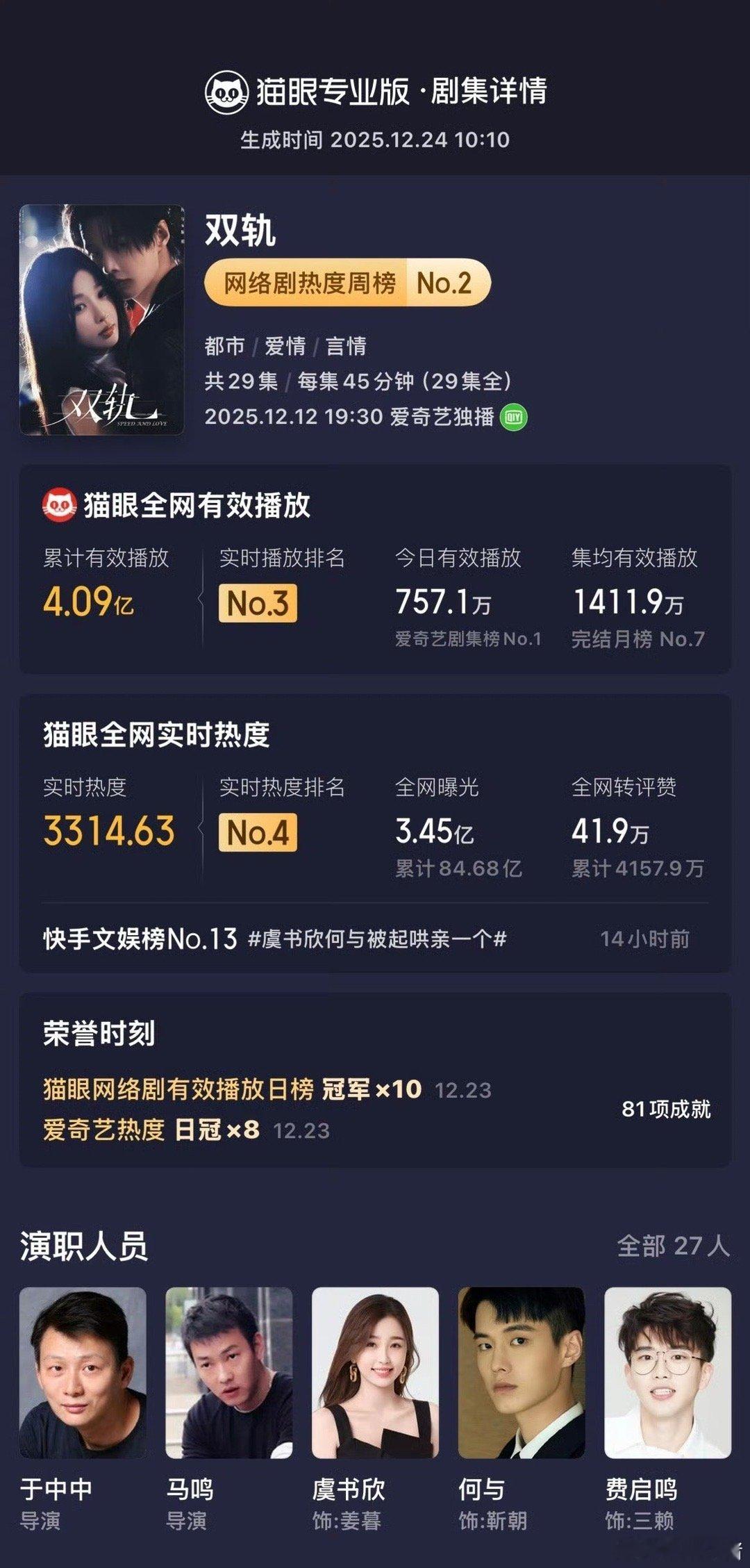 虞书欣何与《双轨》累计10次登顶有效播放榜!