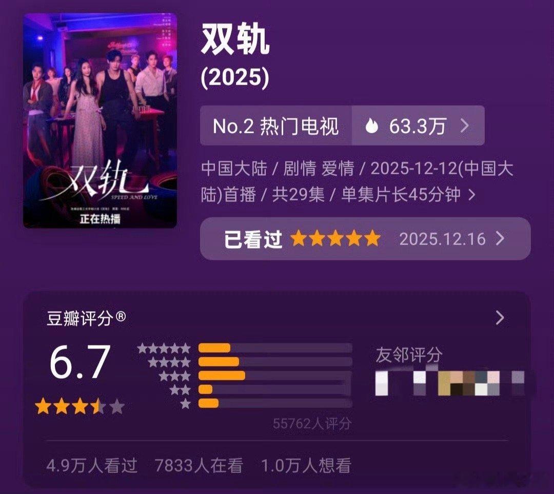 虞书欣何与《双轨》豆瓣开分6.7,5w➕人评分,怎么样?