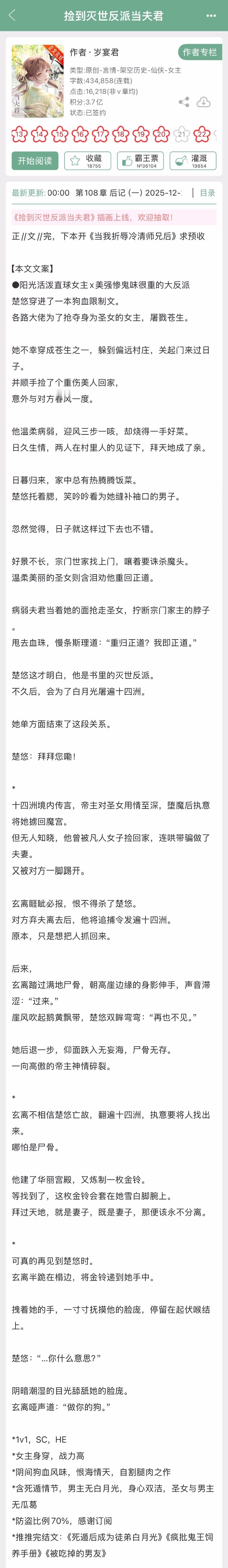 岁宴君的《捡到灭世反派当夫君》完结啦!修真文,阴间狗血风➕恨海情天,阳光活泼直球女主x美强惨鬼味很重的大反派~
