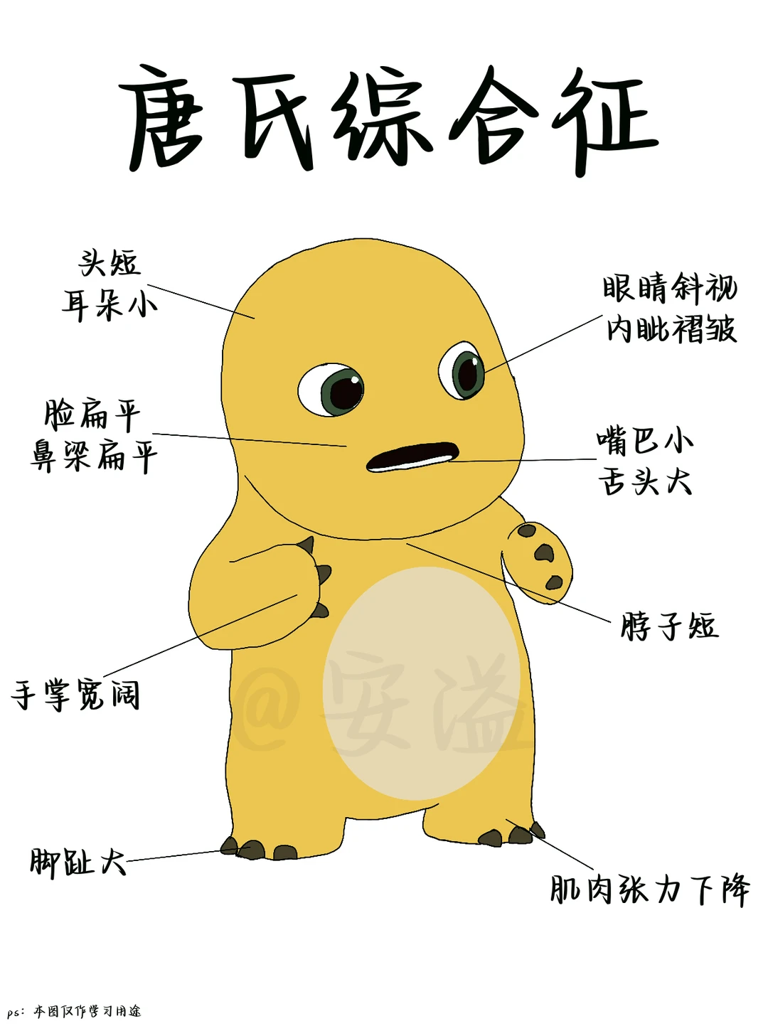 👀21-三体综合征,又称唐氏综合征,是由多出一条21号染色体引发的遗传性疾病,发生率约为1/600至1/1000。患儿通常表现为智力发育迟缓、特殊面容、生长发育缓慢,并可能伴有多种畸形,如先天性心脏病、胃肠道和眼部异常。