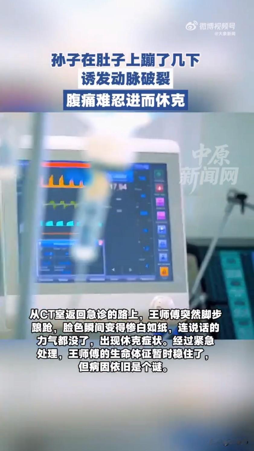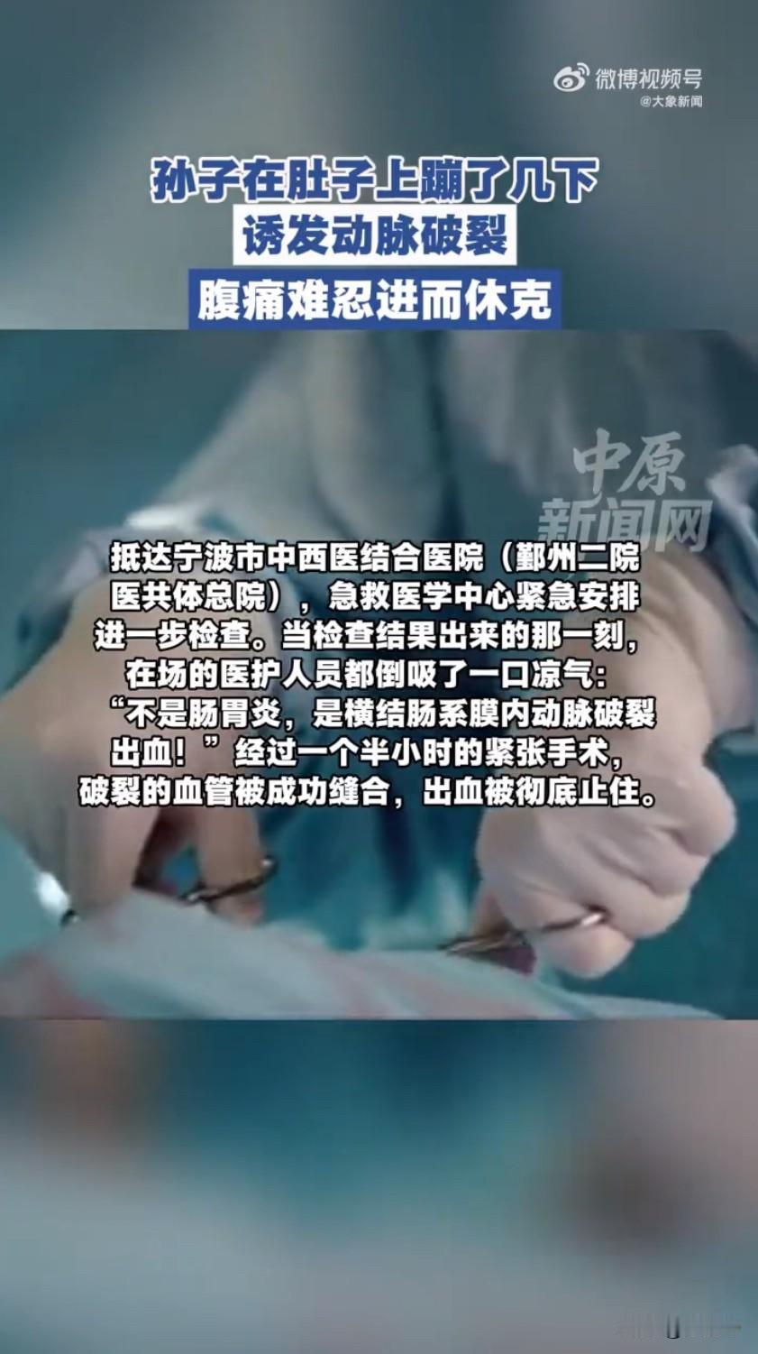 浙江宁波一位60岁的王师傅,怎么也没想到,和小孙子的一场亲昵嬉戏,竟差点让自己丢了性命。那天下午,他抱着孙子在沙发上玩耍,调皮的小家伙兴高采烈地在他肚子上蹦了好几下,王师傅当时只觉得有点不舒服,并没太当回事,只当是孩子活泼好动的正常互动。可谁能想到,这几下蹦跳,已经在他身体里埋下了致命的隐患。 到了凌晨,王师傅被一阵钻心的腹痛惊醒,紧接着又连着跑了四次厕所,拉的全是水样便。他一开始以为是前一晚吃坏了肚子,想着忍忍就过去了,可疼痛越来越剧烈,实在扛不住的他,才赶紧去了医院急诊。接诊的医生一摸他的肚子就觉得不对劲,按压的时候疼,松开手的瞬间疼得更厉害,这种“按压痛+反跳痛”的症状,根本不是普通肠胃炎该有的样子。可王师傅当时疼得直冒冷汗,还一个劲催着医生开止泻止痛药,不想做多余检查。好在医生坚持原则,耐心劝说他必须查清楚病因,不然可能会更危险,这才说服王师傅同意做CT。 没想到刚做完CT往急诊走,王师傅突然脚步踉跄,脸色一下子变得惨白如纸,连说话的力气都没了。医生赶紧扶住他,一测血压才80/40mmHg,这已经是休克的信号了!医护人员立刻行动,接上心电监护仪,同时建立两路静脉通路给他补液升压,好不容易才暂时稳住了他的生命体征。随后,王师傅被紧急转运到总院,进一步检查结果出来后,在场的医护人员都倒吸了一口凉气,原来不是肠胃炎,而是横结肠系膜内动脉破裂出血! 医生打了个通俗的比方,这就像肚子里的一根水管破了,鲜血一个劲地往腹腔里流,这才是导致他剧烈腹痛和休克的真正原因。要是再晚一点送到医院,腹腔里积血太多,后果根本不堪设想。情况万分紧急,医院立刻安排了手术,医护团队争分夺秒地在手术台上奋战了一个半小时,终于成功缝合了破裂的血管,彻底止住了出血。经过后续治疗,王师傅从急诊重症监护室转到了普通病房,病情慢慢稳定下来,回忆起这场惊魂经历,他至今仍心有余悸。 其实王师傅的遭遇并不是个例,之前还有湖南的一位外公,被四岁外孙在肚子上踩了一脚,当时没在意,十天后突然出现剧烈腹痛,检查发现是肾上腺动脉破裂,肾周大出血,也是经过紧急手术才转危为安。医生解释说,老年人身体机能慢慢衰退,血管弹性变差、脆性增加,腹部又是脏器和血管集中的地方,没什么肌肉保护,就算是孩子的体重,在蹦跳时产生的冲击力也不小,足以让脆弱的血管破裂。更危险的是,这种内脏损伤还可能出现迟发性出血,当时没症状,过几天才突然爆发,很容易被忽视。 现在王师傅还在医院慢慢康复,这场意外也给大家提了个醒。家里有老人和小孩的,平时互动一定要注意方式,千万别让孩子在老人的腹部、腰部随便蹦跳踩踏。尤其是在沙发、床上这种有弹性的地方,冲击力会更大,很容易造成意外。老年人的身体经不起这样的折腾,看似亲昵的举动,可能藏着致命风险,守护长辈的健康,就得从这些日常细节上多留心。 来源:中原新闻