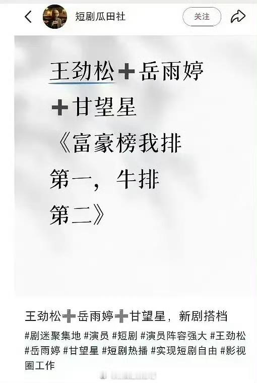 短剧真的是大势了!王劲松都去拍短剧了,和岳雨婷、甘望星合作。
