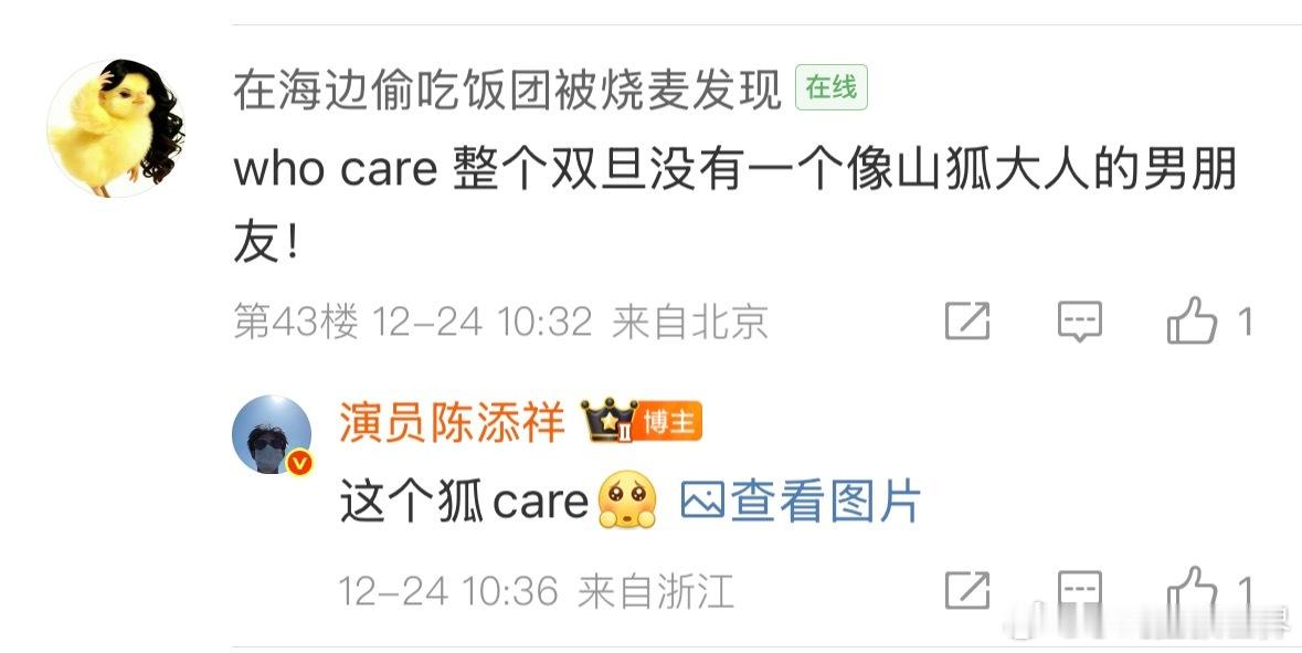 陈添祥狐care 哇塞!平安夜陈添祥带着新片白发男狐狸精的魅力来宠粉啦!在超话翻牌和粉丝互动超积极,听到粉丝说节日孤单,他“这个狐care”的回应就像冬日热可可,甜到粉丝心里,必须粉他一辈子!