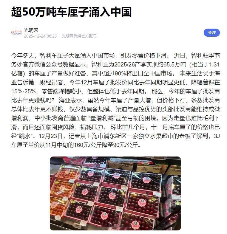 大降价!超50万吨车厘子涌进中国,批发商咋还不赚钱了? 最近逛菜场、超市的都能发现,往年贵得舍不得买的车厘子,今年便宜多了。为啥?因为超50万吨车厘子正扎堆往中国运。 智利那边说,今年产季能出65.5万吨车厘子,90%以上都要卖给咱们。本来生活的买手也说,12月批发价比去年降了15%-25%,零售端也便宜了。 这时候大家可能会想,卖得多肯定赚得多吧?其实不是,多数批发商今年反而更不赚钱,不少中小批发商还亏了,就少数大批发商能勉强撑住。 上海果蔬市场的批发商老周,最近天天愁眉苦脸算账。他说一箱5公斤的车厘子,进货320元,卖350元,看着赚30元,扣掉运费和损耗,最后顶多赚15元。 这15元连每天200元的档口租金都不够,更别说人工、冷库费了。去年同款一箱能赚50多,一天卖20箱就够本,今年卖50箱利润都没去年多。 而且今年车厘子到港太集中,12月初就有20多万吨海运过来,刚进货第二天就可能降价,根本不敢囤。 有人说,便宜了卖得快,走量不就能赚钱?其实不行。今年批发价降得比成本快,走量根本补不上每斤赚的钱变少。 就说3J车厘子,11月中旬批发价160元/公斤,12月23日就跌到90元,降了快一半。 但进货成本没降多少,从智利拿货价没怎么变,清关、仓储这些固定开销也一分没少,有的批发商甚至进货价比卖价还高,越卖越亏。 除了卖价低、成本高,车厘子娇贵,损耗大也是麻烦。最佳储存温度0-2℃,湿度还得够,稍微差点就烂。 大批发商有专业冷库,损耗还能控制,中小批发商用普通冷库,损耗就会非常高。 更让中小批发商难受的是电商冲击。京东、天猫这些大平台直接跟智利农场签协议,包下十几万吨,跳过批发商。他们海运成本能降不少,卖价自然就比传统渠道要低。 直播带货更狠,头部主播卖的车厘子,算下来比批发商进货价还低,平台靠补贴抢生意,批发商根本赔不起。 也就少数大批发商能赚钱,他们有规模、渠道广,还能提前跟农场订货,搞预售锁定销量,减少囤货风险。 总的来说,超50万吨车厘子涌进来,看着市场热闹,其实中小批发商被价格、成本、损耗、电商这四座大山压得喘不过气。 希望以后能有合理的规则,让供应链上的人都能赚到钱,咱们的“车厘子自由”才能长久。