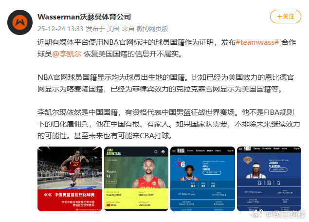 #经纪公司称李凯尔还是中国国籍# 据,近期有媒体平台使用NBA官网标注的球员国籍作为证明,发布teamwass合作球员恢复美国国籍的信息并不属实。NBA官网球员国籍显示均为球员出生地的国籍。比如已经为美国效力的恩比德官网显示为喀麦隆国籍,已经为菲律宾效力的克拉克森官网显示为美国国籍等。李凯尔现依然是中国国籍,有资格代表中国男篮征战世界赛场。他不是FIBA规则下的归化雇佣兵,他在中国有根、有家人。如果国家队需要,不排除未来继续效力的可能性。甚至未来也有可能来CBA打球。(Wasserman沃瑟曼体育公司)