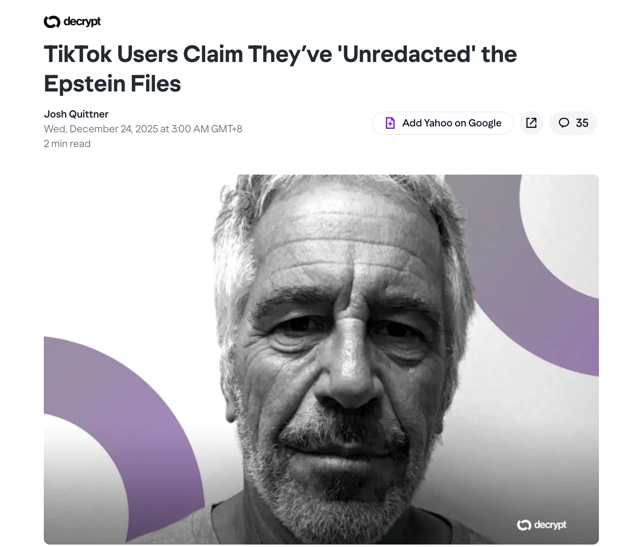 川皇又搞大活了家人们,当然在脱口秀行业川皇已经功成名就了轻易不亲自登台了,这次是他的手下搞得。。。美国公布了一堆爱泼斯坦案的文件,然后在上面是整行或者整夜的涂黑。。。这本来是公布政府机密文件必须的正常的脱敏操作。但是这次不知道怎么搞的,可能是政府效率部裁员搞得太狠了把,这次公布的文件的涂黑,是仅仅改了字体的底色。。。很快 ticktok 用户就发现,用复制黏贴的方法,就能把涂黑部分的原文,给搞出来。。。不可思议啊。。。快乐教育普及了多年的国家。。。愚蠢的下限真的是无法预测啊。。。我们为美国的衰退绞尽脑汁各种筹划剧本,都不如川皇的手下灵机一动啊。。。