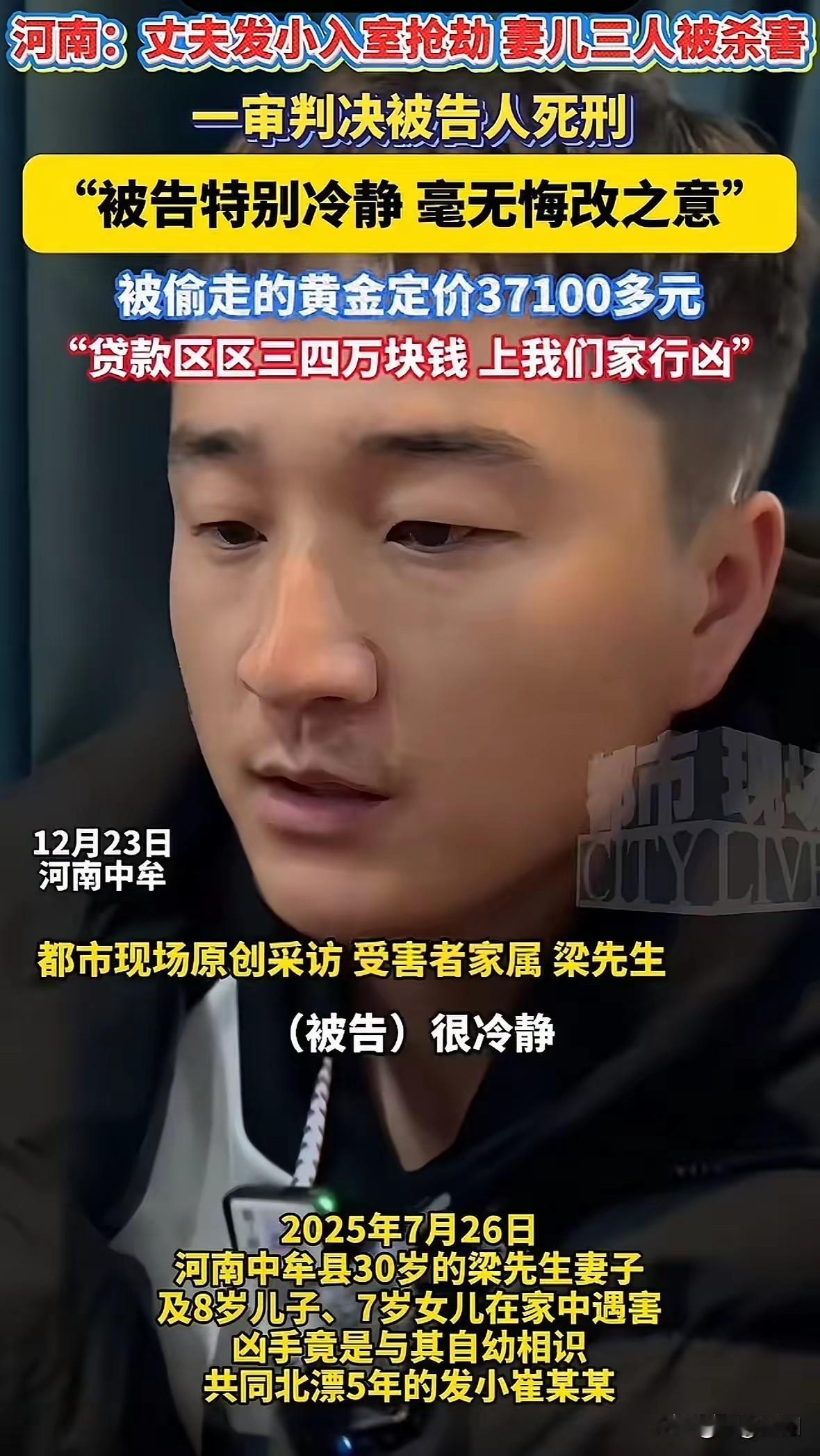 难以置信!发小杀害妻儿一家仨口! 被害人丈夫梁某某和被告人崔某某是一起长大的发小,又是邻居。两家关系很好。两家曾一起经营着废品收购站。后来梁某某去湖北打工,废品收购站交由崔某某经营。 梁某某经常带崔某某回自己家里吃饭,两人从没发生过矛盾。崔某某生话拮据,经常问梁某某借钱,梁某某每次都借给他。每年的借几千甚至上万,崔某某也如数归还。 就在今年5月份崔某某资金周转不开,又向梁某某借钱,梁某某叫妻子微信转给5000元。就在出事前3天,也就7月23日,梁某某问崔某某说自己现在缺钱,能不能归还那5000元,崔某某说刚还了一万元贷款,现在没钱,还不上,再过一段时间再还。 那为什么要杀害发小一家三口,崔某某经常向梁某某借钱,以前有借有还。可是量变往往会引起质,到后来梁某某问他要欠款时,他心生仇恨,他认为梁某某有钱可以帮他,他不想还钱。 于是7月25曰7点左右,他以拿行礼箱为由,来到梁某某家踩点,看见梁某某的妻子在。仅仅过了7个小时。崔某某再一次来到梁某某家作案。他用事先偷配的梁某某家门的钥匙顺利地进入了梁某某家。他一进门首先就去厨房提了一把刀,然后进入卧室在翻找东西的同时惊醒了梁某某的妻子,梁某某的妻子起身和他抓扯。他毫不留情地杀害了母子仨人。 事后打扫完现场,把梁某某妻子的金手链,金项链,金戒指偷走。 崔某某犯抢劫罪,故意杀人罪被判处死刑!