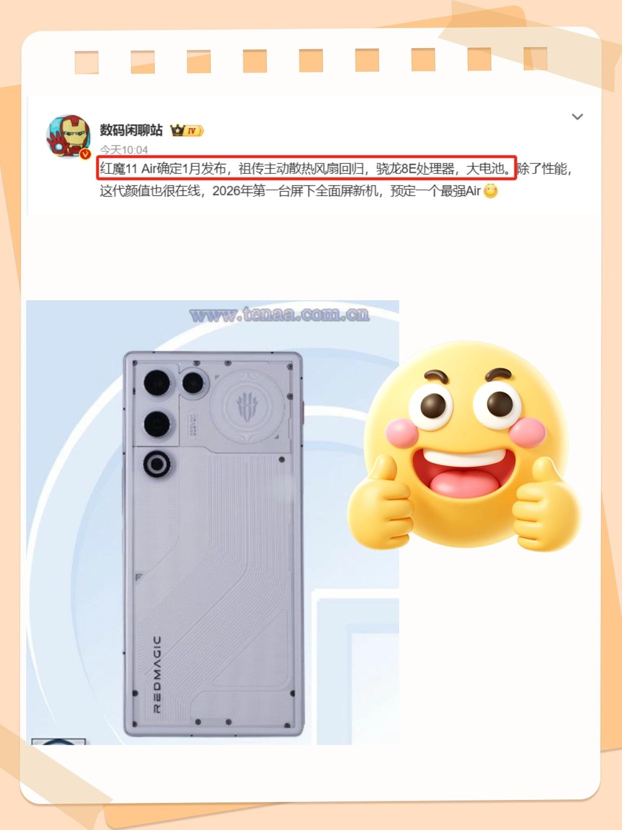 刚刷到红魔 11 Air 的消息,据说2026 年 1 月要发,还是明年首台屏下全面屏~ 配置上,给到了骁龙 8 至尊版芯片,还把祖传主动散热风扇装回去了,再加上7000mAh大电池,专属游戏肩键,游戏党狂喜!!
