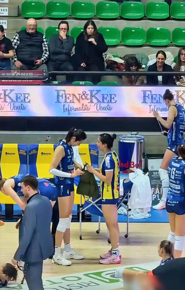 朱婷和庄宇珊赛后场边热聊,庄宇珊还给朱婷带了礼物🎁!! 看她们用意甲赛场上打