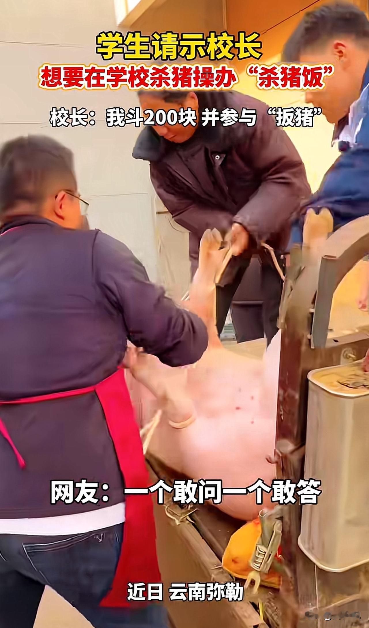#学生说“想杀猪” 校长老师凑钱安排#“这位校长火到被人民日报点赞!”云南弥勒,有学生在办公室请示校长,想要在学校杀猪操办“杀猪饭”,顿时把校长都问懵了。没想到接下来校长这波操作,让人深感意料。他直接说:“我斗200块,并参与“报猪”!冬至这一天,直接凑钱买了一头大活猪,让孩子们过了一个“真香”的冬至。 此事引发众多网友热议,有网友称赞:“这才是最好的劳动教育和生活教育,不是嘴上说珍惜粮食,而是让孩子亲手参与,知道每一口肉都不容易。” 也有网友表示:“这样的校长和老师太暖了,把孩子的一句随口说说,当成认真的愿望去实现。” 其实,在周少看来,孩子们想吃的不只是猪肉,而是那种被重视、被在乎的感觉。一句“想吃年猪”,被校长和老师当成正事来办,这本身就是一种教育:尊重孩子的愿望,用行动告诉他们。你们的话,大人是当真的。 教育,从来不是只发生在课本和试卷里。教育的美好,也往往就藏在这份“把学生的话当真”的真诚里。唯有真心,方能抵达童心;唯有行动,才能教给孩子:你们的愿望,值得被尊重和实现。#寻美三湘# #长沙新朋友#