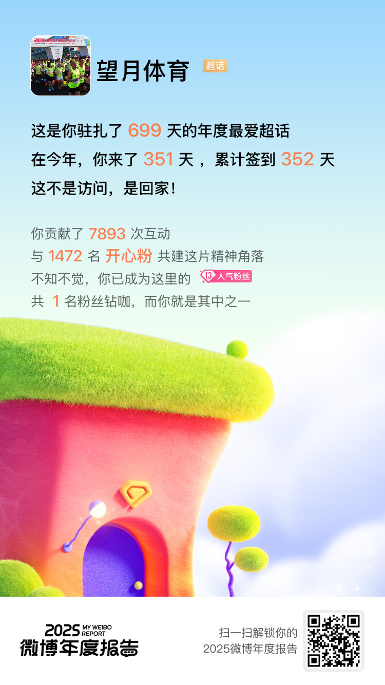微博年度报告 毫无悬念,我的年度TOP1超话必须颁给望月体育 !这里是同好基地,是永远的家!速来>2025微博年度报告 看看你最爱的那个超话吧!微博之夜