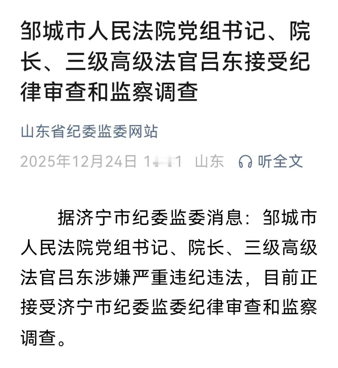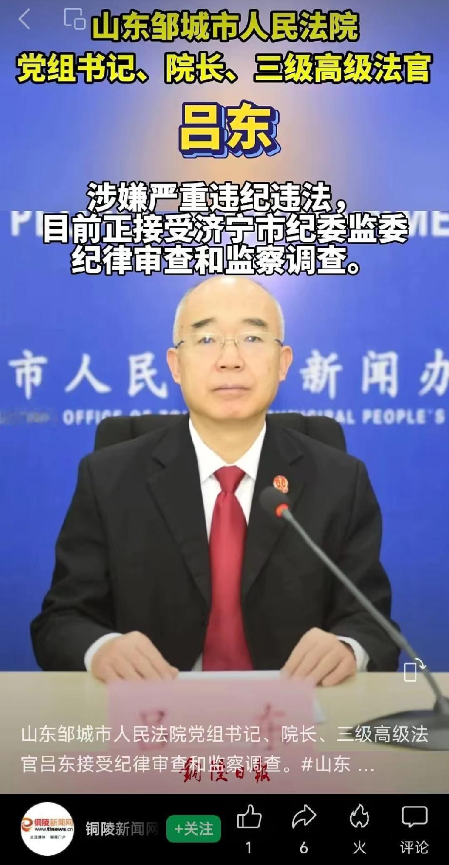 邹城市的吕东,今天彻底栽了。 这个吕东也不简单,网上关于他的公开资料很少,出生年月不详,学历信息不详。 仅知道他此前曾担任济宁市中级人民法院民事审判第五庭庭长。 落马前曾担任,邹城市人民法院党组书记、院长,三级高级法官。 这里的邹城市虽然是市,但只是县级市,由济南市代管,总人口115万,也属于人口比较多的县级市。 记得在去年4月份,吕东,还曾在法院党风廉政会议上要求干警“筑牢拒腐防变防线”。 没想到,嘴上说的冠冕堂皇,背地里却是一个“双面人”,真的是令人痛恨。