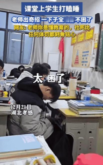 [微风]12月21日,湖北孝感,老师正在上课,突然发现一学生打瞌睡,不料,老师没有责骂,也没有生气,而是贴心的走过去,将学生拉起来,抱到自己怀里,让学生继续睡!学生当场社死,这一下子全班都不困了,网友:老师你是懂教育的,社死比任何体罚都刻骨铭心!   (信源:大河网视频)   比起打骂、体罚等强硬手段,“共情式+适度警示”的教育方式,效果往往更好。   心理学上有个“羞耻激励”的说法,适度的羞耻感能让学生快速意识到问题,还不会伤害其自尊心。   这位孝感老师的做法,就是把共情和羞耻激励结合到了极致,既照顾了学生,又起到了警示作用。   从视频里能看到细节:当时是上午最后一节课,阳光透过窗户照进教室,不少学生都有点昏昏欲睡。   这位老师正在讲台上讲数学题,目光扫到后排时,发现一个男生趴在桌上,脑袋一点一点的,明显是熬不住睡着了。   教室里瞬间安静下来,其他同学都屏住呼吸,等着看老师发火。毕竟上课打瞌睡,轻则被点名批评,重则可能被请去办公室谈话。   可没想到,老师轻轻放下手中的粉笔,脚步放得很轻,慢慢走到男生身边。   他没有拍桌子,也没有叫醒学生,而是蹲下来看了看,发现男生眉头皱着,像是没休息好。老师犹豫了几秒,然后轻轻拉着男生的胳膊,把他从座位上扶了起来。   紧接着,让人意外的一幕发生了——老师张开双臂,直接把男生抱进了怀里,还拍了拍他的后背,轻声说:“困就再睡会儿,老师抱着你,不耽误大家上课。”   男生瞬间就醒了,眼睛瞪得大大的,脸从脖子红到耳朵根。   他想挣扎,又不好意思,只能僵硬地靠在老师怀里,双手紧紧攥着衣角,恨不得找个地缝钻进去。   全班同学先是愣了两秒,然后憋不住想笑,却又不敢大声,课堂气氛一下就活跃起来,之前的困意全没了。   老师抱着男生待了大概半分钟,就轻轻把他放回座位,摸了摸他的头说:“下次要是晚上没睡好,提前跟老师说,咱们可以调整一下。上课打瞌睡不仅学不到东西,还容易着凉。”   男生低着头,小声说了句“谢谢老师,我再也不困了”,之后全程坐得笔直,听得格外认真。   这段视频传到网上后,瞬间火了。网友们纷纷留言:“这老师太暖了,换我肯定再也不敢上课睡觉了”“社死现场啊,比骂我一顿还管用”“这才是教育的真谛,有温度又有力度”。   还有不少老师表示,要借鉴这种方式,多站在学生的角度考虑问题。   其实类似的“暖心教育”案例还有很多。就像有的老师发现学生没吃饭,会把自己的早餐分给学生;有的老师会用幽默的话语化解学生的尴尬,比严厉批评管用得多。   优秀的教育者都知道,教育的核心是“点燃”学生,而不是“压制”学生,只有让学生感受到爱和尊重,他们才会主动改正错误。   王老师的做法,给所有教育者提了个醒:教育不是硬碰硬,有时候温柔的“反击”,反而能达到意想不到的效果。   对于学生来说,这样的经历会记一辈子,比任何说教都深刻。   你遇到过这么懂教育的老师吗?评论区聊聊你的故事,也把这份教育的温度分享给身边人!