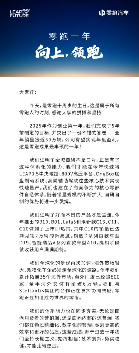 25年销量创新高,26年冲击百万,零跑的上限到底在哪儿? 今天看到零跑十周年写给全体员工的信,心里还挺有感触的。这十年从零到一,零跑交出了一份扎实的答卷,用2025年全年接近60万台的销量给第一个十年画了个圆满的句号。 当我们把零跑的热销进行拆解,你会看到全球销量超20万台的C10、累计破30万台的C11、还有上市三天就破7000台的Lafa5,个个都是爆款,这在当前的新势力乃至整个新能源市场都尤为难得,这充分说明了零跑的造车哲学在每一款车上都得到了销量的印证。另外,我们还注意到其全年海外交付有望破6万,已拓展了35个海外市场和超800家门店,可见零跑在短短一年多的时间里,就在海外快速拓展,站稳脚跟。 零跑能卖得这么好,核心就是四个字:好而不贵。它没有盲目追求高溢价,而是把全域自研的优势发挥到极致,像LEAP3.5中央域控、800V高压平台这些核心技术都能快速量产,再加上核心部件自造把成本控制住,才能让消费者用实惠价买到高配车。 不过零跑并没有满足于眼前的成绩,信里还提到2026年要冲击百万销量,看得出来野心不小。新的十年,相信只要零跑能够把“好而不贵”的路线走到底,冲击百万销量、成为世界级车企的目标,或许真能实现。