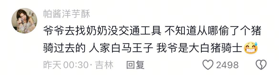 爷爷去找奶奶没交通工具,不知道从哪偷了个猪骑过去的,人家白马王子,我爷是大白猪骑士