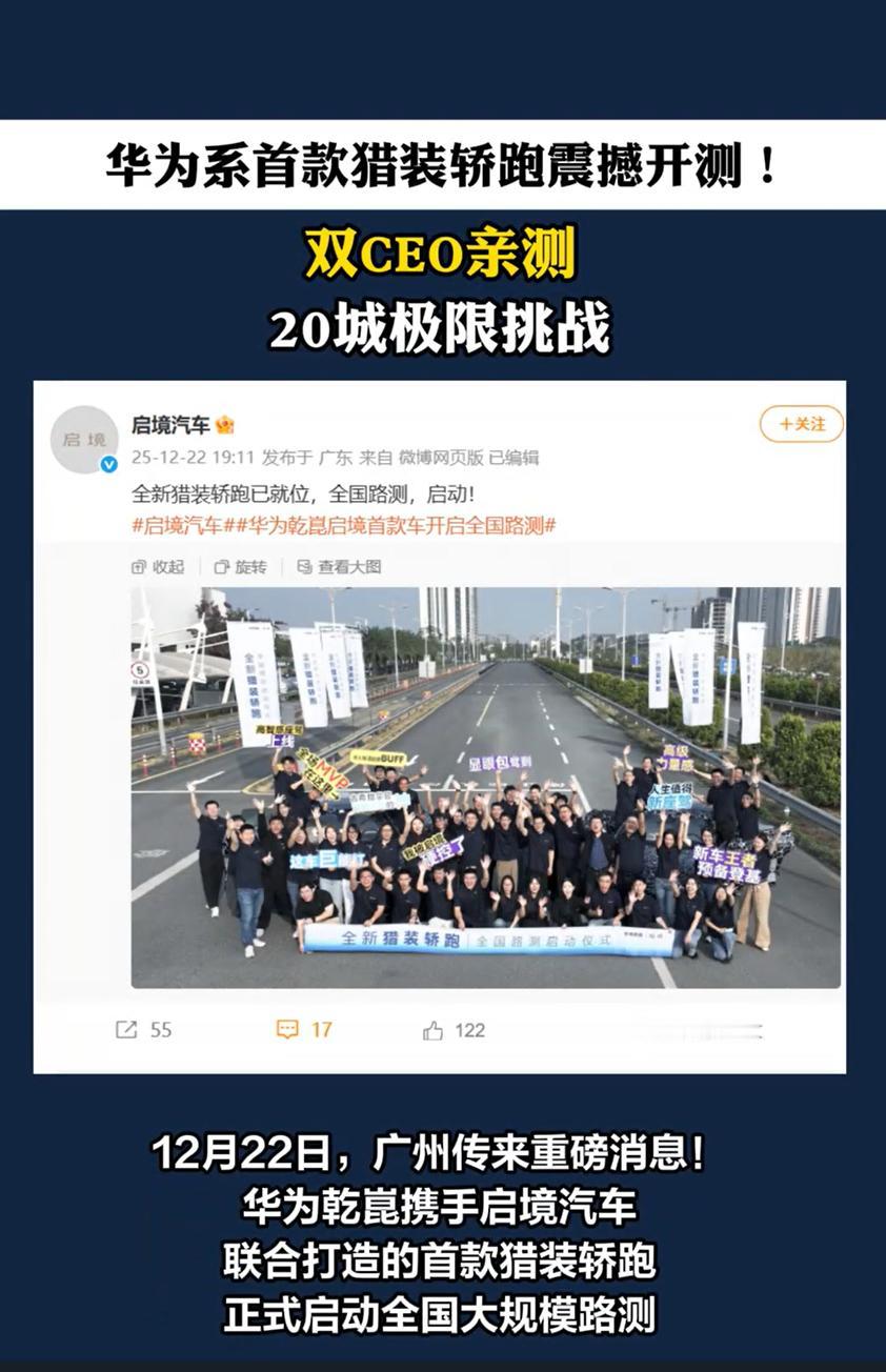 安全是最大豪华,华为乾崑启境用硬核标准定义猎装轿跑新标杆 华为乾崑与启境联手打造的全新猎装轿跑,在12月22日开启的全国大规模路测中,将“安全是最大豪华”的产品哲学落到实处。两位CEO在试驾核验过程中,多次强调对安全性能的极致追求,从车身结构强度到底盘稳定性,每一处细节都经过严苛把关。华为乾崑的技术加持,让这款定位"三百万"级猎装轿跑在驾控与智能维度同步进阶,XMC底盘融合技术带来细腻滤震与精准转向,即将上车的最强ADS系统更将补足智能安全短板。大规模路测只是起点,后续冬测的极端工况考验还将持续打磨产品品质。在用户愈发看重安全与体验的当下,华为乾崑与启境的这份坚持,不仅为消费者打造出真正的安心座驾,更推动中国高端新能源车市场朝着更注重品质与价值的方向发展。