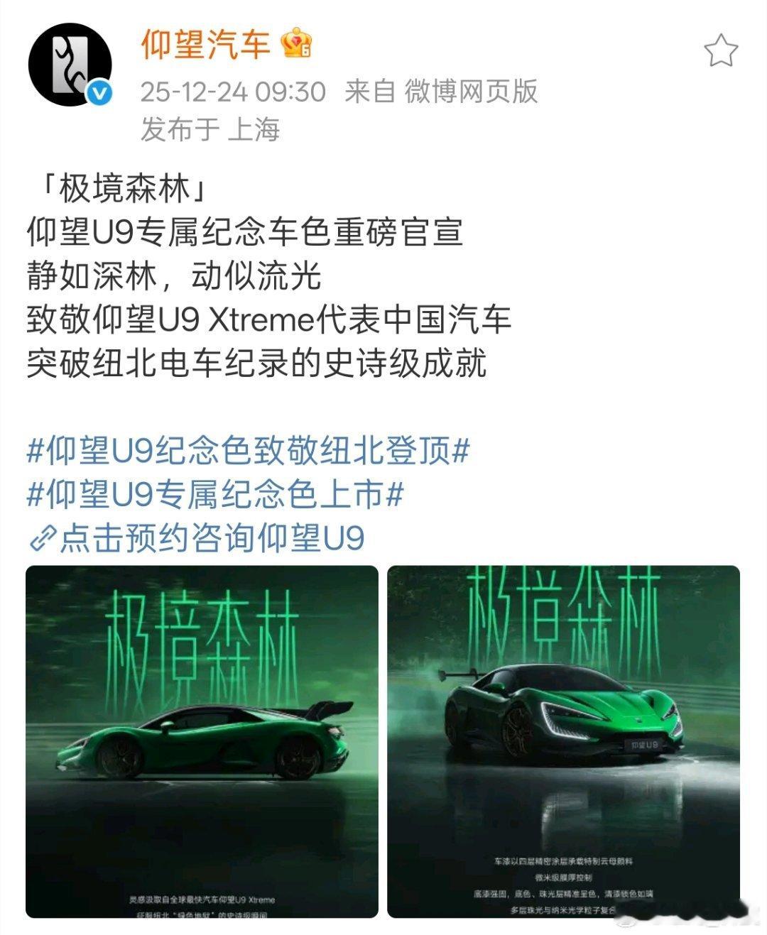仰望U9专属纪念色上市「极境森林」仰望U9纽北电车期待新的惊喜!仰望U9纪念色