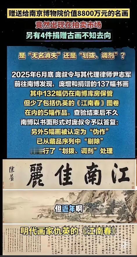 这瓜吃到现在,真是越来越心惊!南京博物院这潭水,远比我们想的要深得多!一场国宝失踪案,竟然牵出了长达十几年的惊天举报!   起初,大家以为这只是一起国宝离奇失踪的悬案。毕竟,事情的开端就足够震撼了。   2025年5月,收藏家庞莱臣的孙女庞叔令偶然发现。   自家60多年前无偿捐赠给南京博物院的镇院之宝之一,明代仇英的《江南春》图卷。   竟然堂而皇之地出现在北京一家拍卖行的预展上。   更吓人的是它的估价,高达8800万元!这事儿已经够离谱了。   一幅本该躺在博物馆库房里的国宝,怎么就跑到拍卖场上准备换钱了?   面对庞家后人的举报,拍卖行紧急撤拍。   然而,南博接下来的回应,更是让人大跌眼镜,简直是在挑战公众的智商底线。   他们轻描淡写地表示,这幅画连同其他四件庞家捐赠的珍品,早在1961年和1964年就被专家组鉴定为“伪作”了。   既然是“伪作”,自然就算不上馆藏文物。   于是乎,在1997年,这幅“伪作”《江南春》就以6800元的白菜价,“调剂”给了江苏省文物商店。   你没看错,就是六千八百块。一件如今估价近亿的画作,当年就这么被打发了。   这专家是眼神不好,还是心太黑?   更蹊跷的是,南博提供的所谓鉴定记录,关键信息上打满了马赛克。   而当年的鉴定专家之一徐沄秋,被扒出根本不是书画鉴定专家,而是南博自己的征集人员。   这叫什么?自己人鉴定自己家的东西,说它是假的,然后就能名正言顺地低价处理掉?这操作简直是天衣无缝的“合法”侵吞。   就在公众对南博这套说辞感到愤怒又无力时,一个更大的炸雷响了。   2025年12月21日,南博典藏部一位名叫郭礼典的退休老员工,站了出来。   这位69岁的老人,联合了其他42名同事,进行了实名举报。   他们的矛头,直指南京博物院的前院长——徐湖平。   郭礼典在视频里爆料,徐湖平在任期间,涉嫌系统性地监守自盗。   他曾擅自撕开南京朝天宫库房里故宫南迁文物的封条,染指了多达2211箱,约10万件的国宝。   举报信里的描述更是触目惊心:徐湖平指使他信得过的“专家”,将库房里的真品鉴定为赝品,然后通过他自己主管的江苏省文物商店低价卖出。   这些“赝品”随后又通过他儿子在上海开的拍卖公司,转手倒卖给法国商人等,形成了一条完整的黑色产业链,牟取惊天暴利。   这已经不是简单的管理失职了,这简直是把国家宝库当成了自家的提款机!   面对如此严重的指控,这位80多岁的徐前院长只是淡淡地回应,说自己没经手过《江南春》的事,一切“等上级调查结果”。   话说得云淡风轻,但有眼尖的网友发现,他家中陈列的黄花梨太师椅、宋代钧窑器,似乎在默默讲述着另一个完全不同的故事。   从2008年开始,郭礼典和他的同事们就一直在举报,但十几年过去,都石沉大海。   如果不是这次庞家的事闹大,恐怕这些举报信还要继续沉睡。   这背后暴露出的问题,让人不寒而栗。文物鉴定,这个本该极其严肃专业的领域,在某些人手里,成了一个可以随意拿捏的“黑箱”。   真与假,全凭个别“专家”一张嘴。他们说真就是真,说假就是假。   这种缺乏监督的鉴定机制,为“以假换真”的盗卖行为打开了方便之门。   而《博物馆藏品管理办法》中那个语焉不详的“调剂”规定,更成了国宝流失的制度漏洞。   捐赠人连最基本的知情权都没有,眼睁睁看着祖辈心血被如此糟蹋。   好在,天网恢恢。   这起事件终于惊动了最高层。12月23日,国家文物局宣布成立工作组,南下核查。   江苏省委省政府也火速组建了由纪委监委、公安等部门参与的联合调查组。   官方的介入,让人们看到了一丝彻查到底的希望。   这已经不仅仅是南京博物院一家的丑闻,而是对整个文博系统反腐决心的严峻考验。   如今,调查组已经进驻南京。庞叔令也已向法院申请强制执行,要求南博必须公开那几件失踪文物的确切去向。   我们希望,这次调查不要再像过去那样被“高高举起,轻轻放下”。   必须有人为流失的国宝负责,必须有人为这长达数十年的制度黑洞付出代价。   否则,我们还怎么有脸面去向海外追讨流失的文物?   毕竟,最大的国贼,往往就藏在内部。