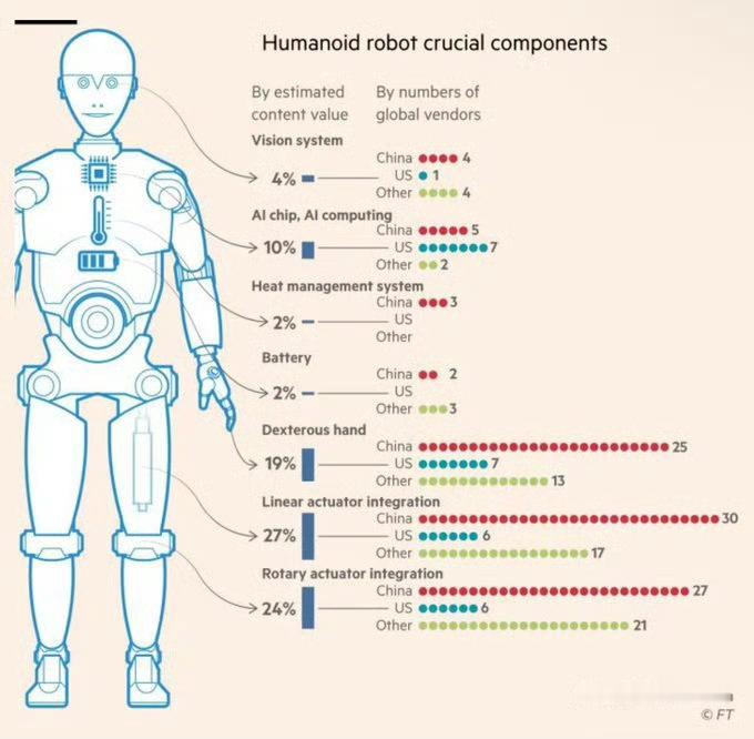 数据图显示,关于人形机器人制造,在计算领域方面美国占具优势,但其他方面几乎都被中国主导。 海外新鲜事热点现场