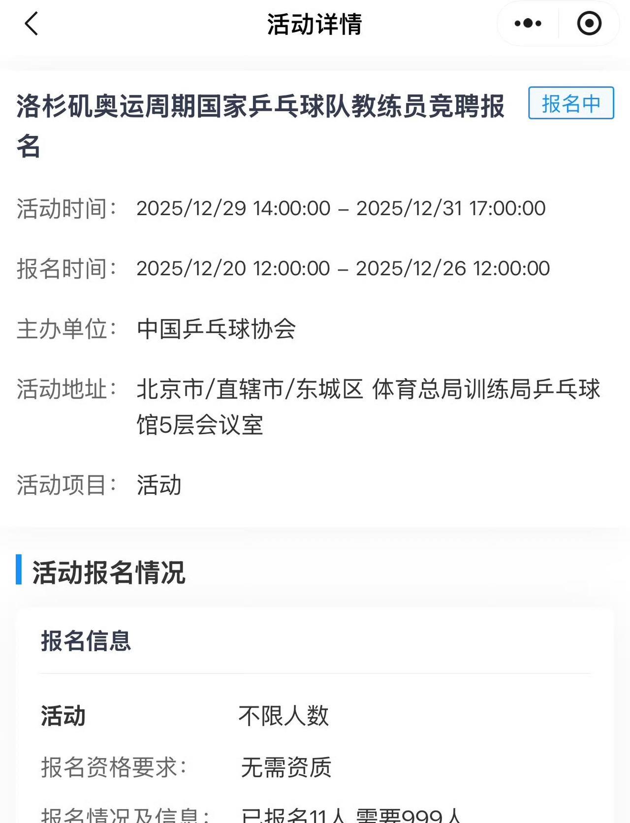 马龙在教练员竞聘报名期间,及时拿到了国家级教练资格证,马龙会不会报名竞聘国家队教练员? 从乒协官网可以看到,教练竞聘报名时间已过去了三天,才有11人报名,而报名截止日期是26号,还剩下三天时间。 不过,一眼望去,能满足竞聘教练条件的人好像也不是很多。所以在这关键时刻,马龙获得了国家级教练的资格证难免让人联想到,马龙是不是要走马上任了? 不过,如果马龙真的要回来当教练,应该会很受欢迎!就是不知道谁可以这么幸运能让马龙成为他(她)的主管教练呢?很期待。