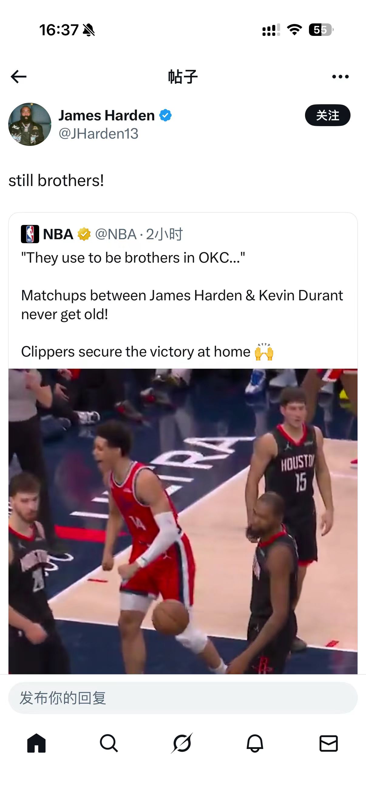 在今天快船队主场大胜火箭队。 赛后NBA官方发布了社交媒体动态,并且配文到: 他们曾经是俄克拉荷马雷霆队并肩战斗的兄弟。 无论什么时候,詹姆斯-哈登和凯文-杜兰特之间的对决都不会有过时的时候。 而在这个夜晚,快船队成功守住了他们的主场。 而这条动态也被詹姆斯-哈登看到,随后哈登评论到:依旧是兄弟!