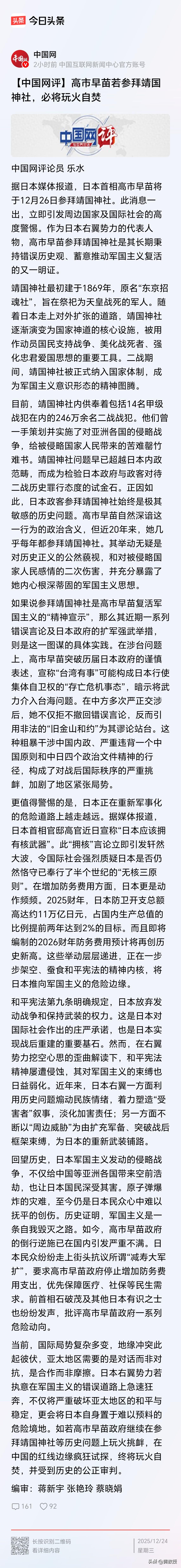 【中国网评】 高市早苗若参拜靖国神社,必将玩火自焚