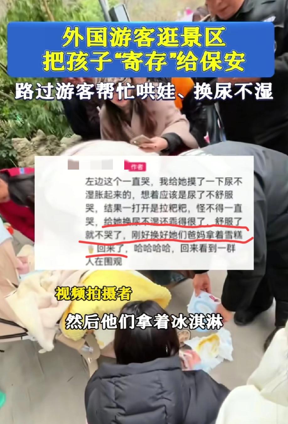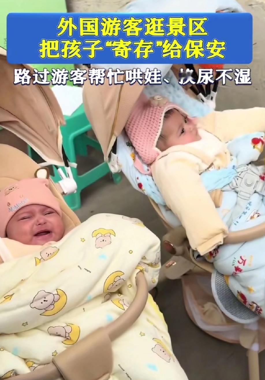 12月22日,贵州黔灵山公园,一对外国夫妻逛景区将双胞胎婴儿“寄存”给保安,路过的中国宝妈帮忙换尿不湿哄娃,“他们联系方式都没留,看完风景后回来了”…… 网友锐评:中国的治安好应该是全世界所公认的,这也是这对夫妻敢如此放心的交给保安的原因。可如果我是保安,我是绝对不会愿意帮他们看孩子的,看的好落不得好,看的不好那就摊上大事了。 诸位看官,如果你们遇到类似的事情,你们会出手相帮吗?